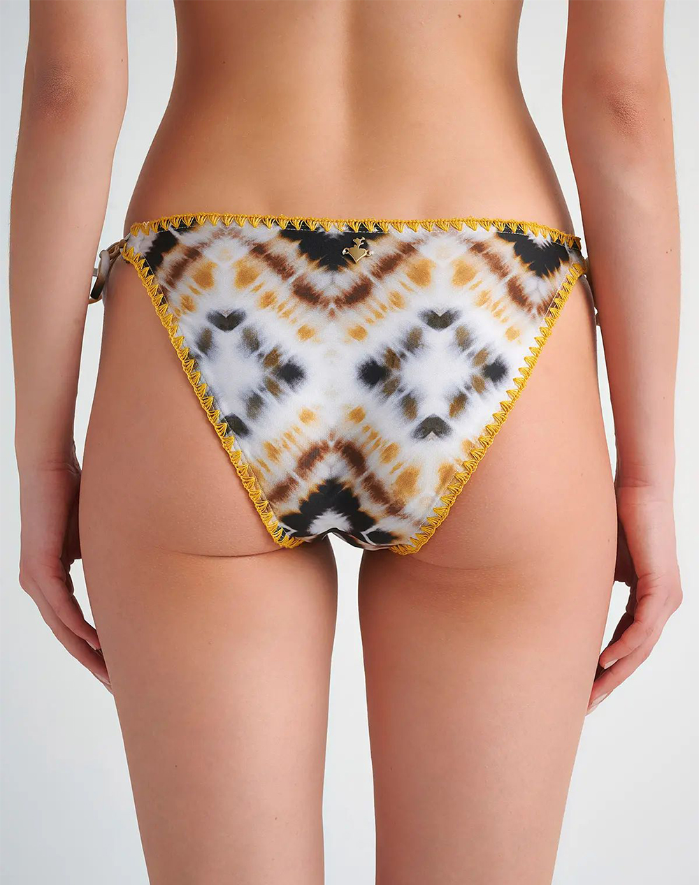 Γυναικείο bikini slip, χαμηλόμεσο, εμπριμέ, με δέσιματα στα πλαϊνά και μέτρια πίσω κάλυψη. (Σύνθεση: 85% Πολυεστέρας, 15% Ελαστάνη)