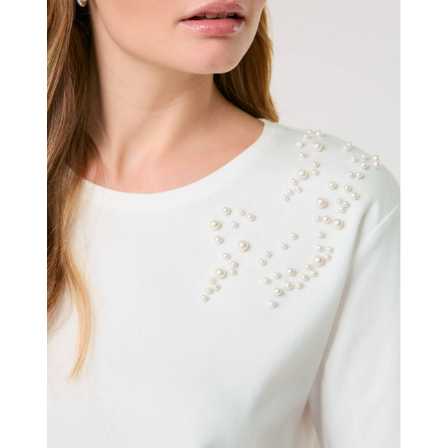 Γυναικείο t-shirt μονόχρωμο, σε κανονική γραμμή, κοντομάνικο με στρογγυλή λαιμόκοψη και διακοσμητικές πέρλες στους ώμους. (Σύνθεση:100% Βαμβάκι)