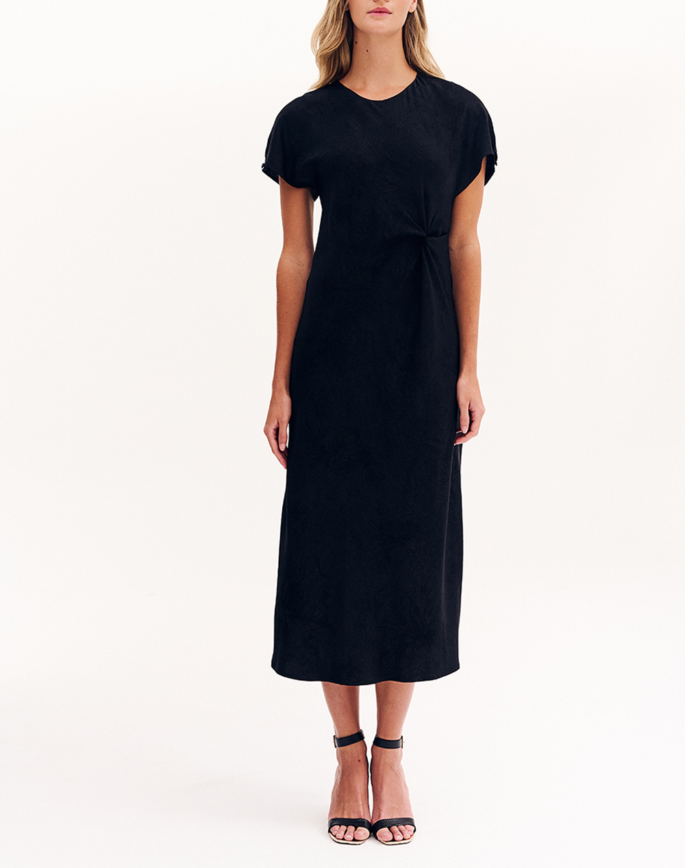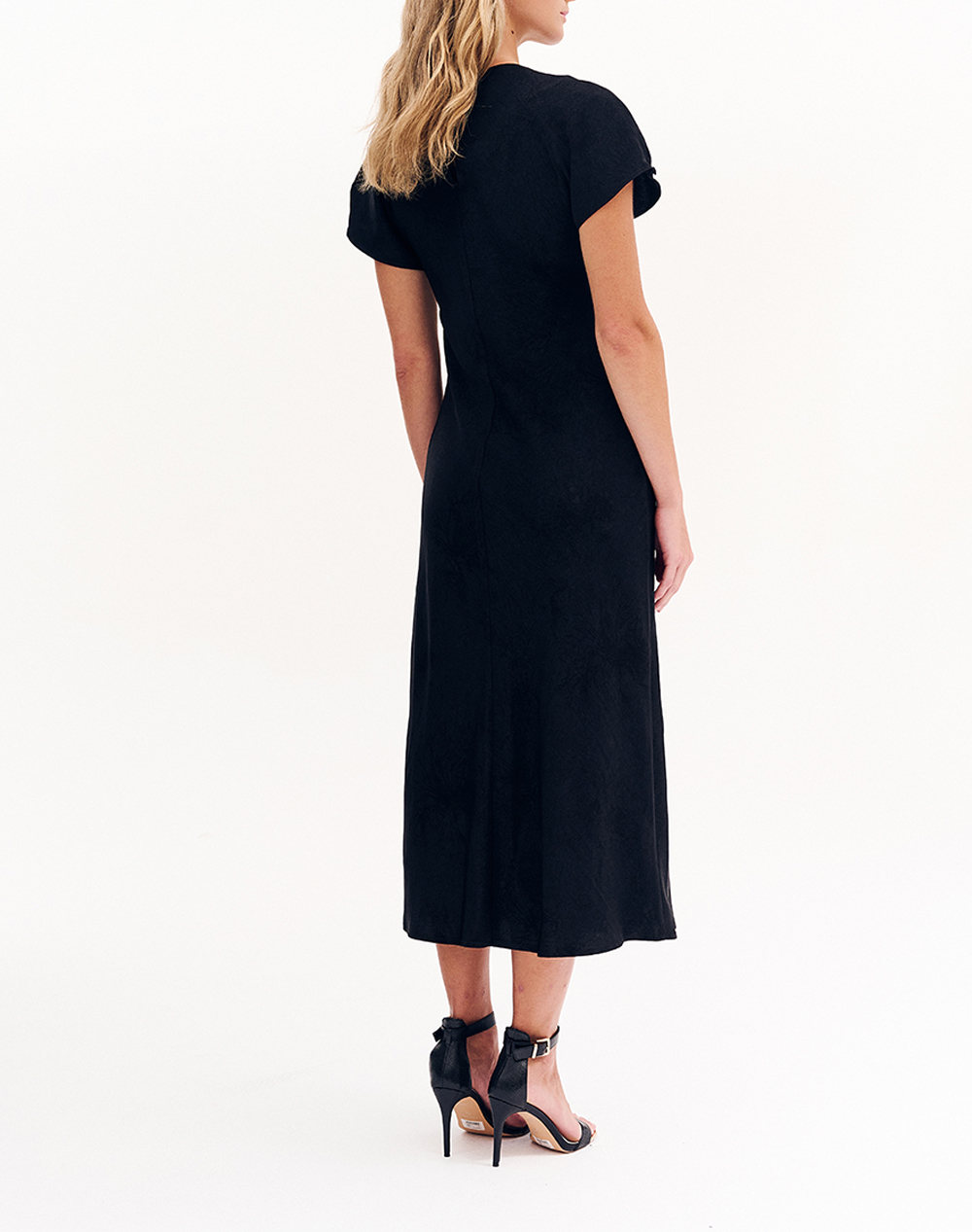 Γυναικείο σατέν φόρεμα, κοντομάνικο, με στρογγυλή λαιμόκοψη, ντραπέ σχέδιο μπροστά και κλείσιμο με κουμπί στην πλάτη. (Σύνθεση: 100% Πολυαμίδιο)