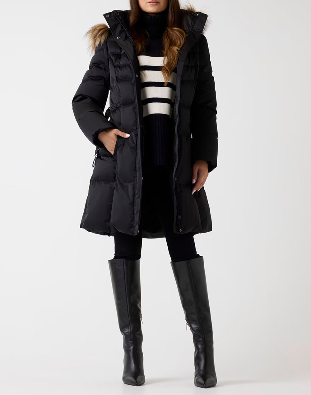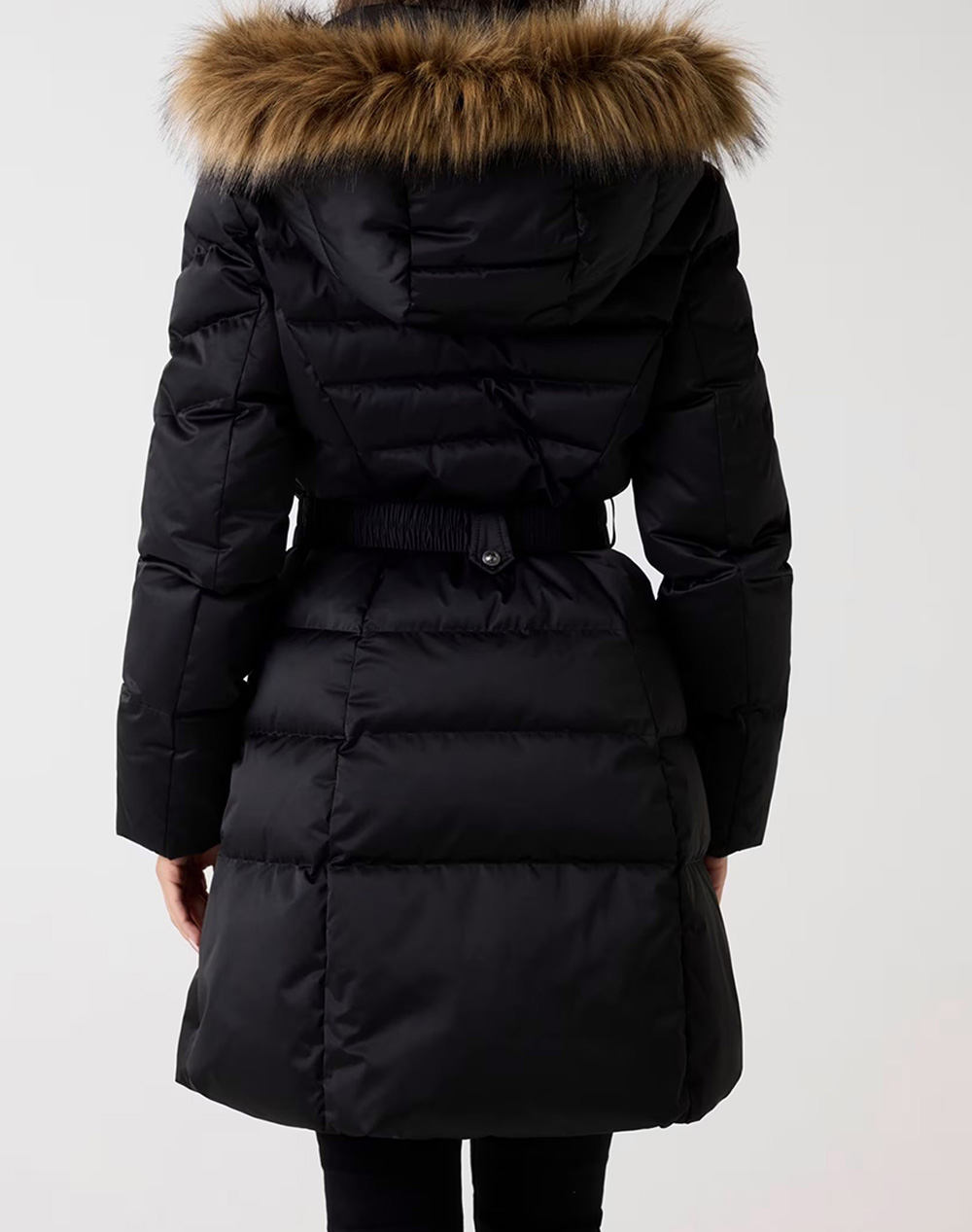 Γυναικείο μακρύ μπουφάν puffer, με καπιτονέ σχέδιο, κουκούλα με γούνινη λεπτομέρεια, μπροστινό κλείσιμο με φερμουάρ και κουμπιά και ελαστική ζώνη στη μέση. (Σύνθεση: 100% Πολυεστέρας, Γέμιση: 100% Αληθινά πούπουλα)