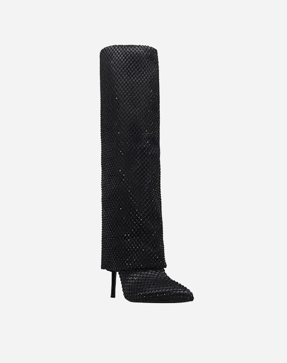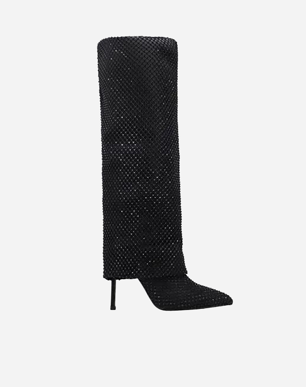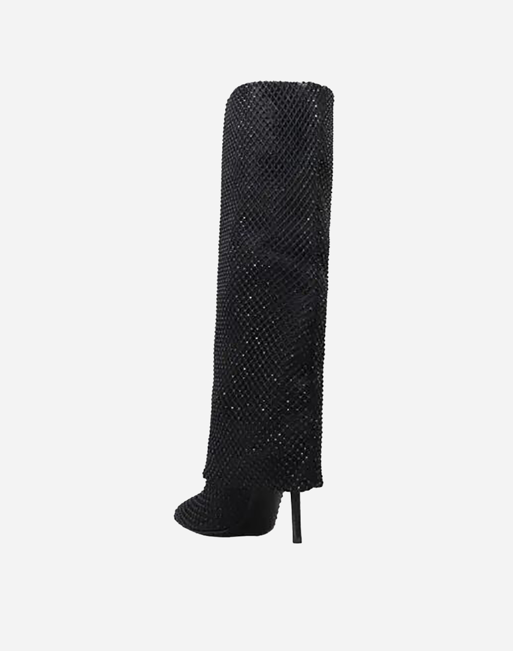 Γυναικείες μπότες, με μυτερή μύτη, μήκος μέχρι το γόνατο, διχτυωτό σχέδιο με strass λεπτομέρεις και slip on εφαρμογή. Ύψος τακουνιού: 9.5εκ. (Σύνθεση: Ύφασμα)