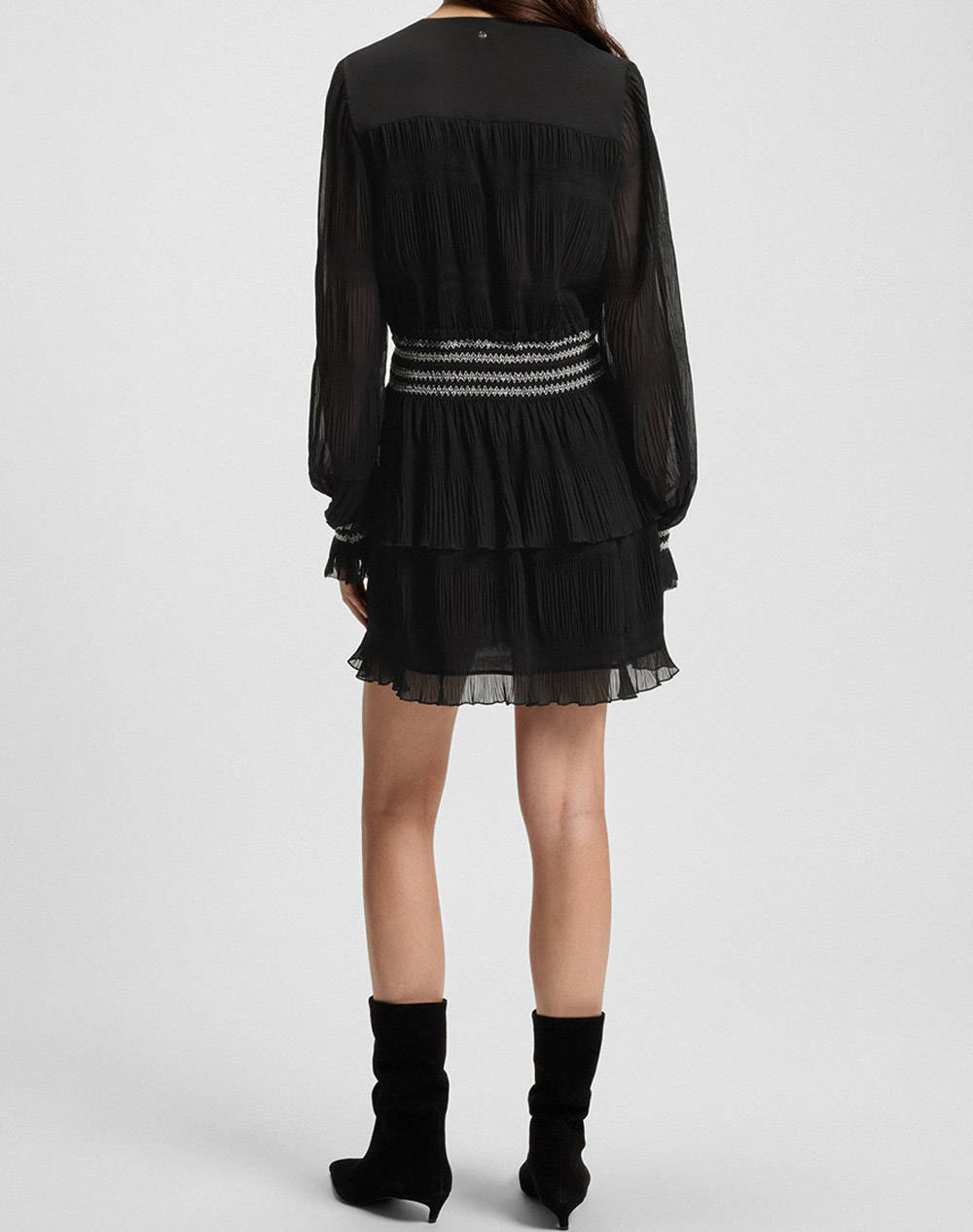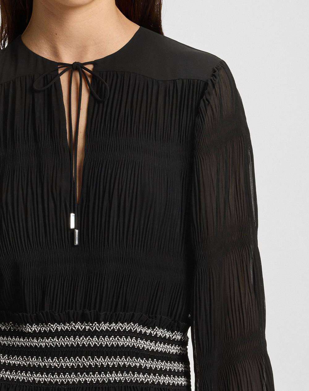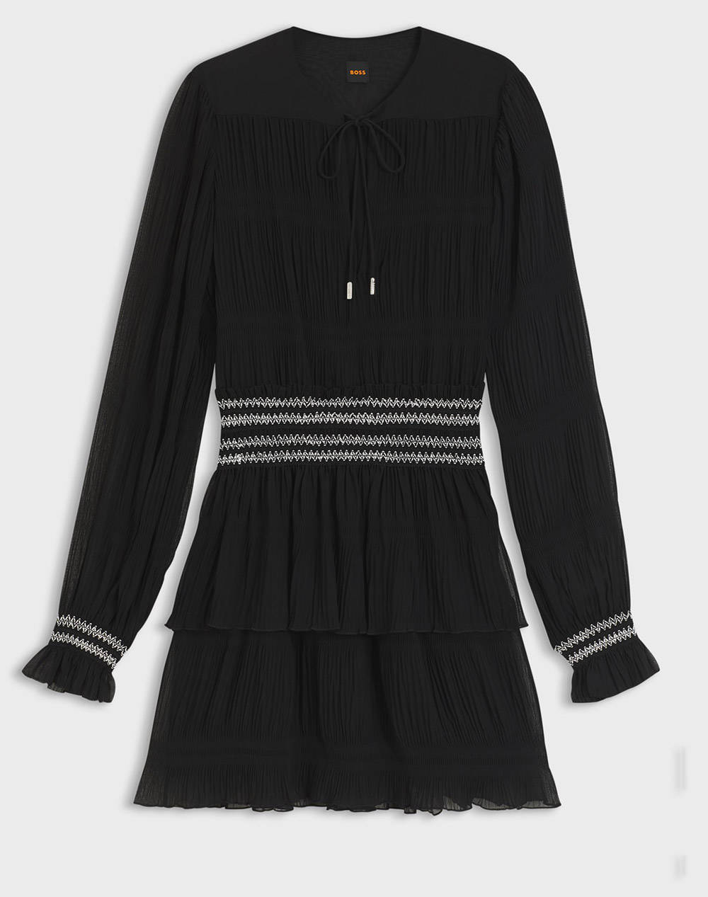 Γυναικείο φόρεμα, σε κανονική γραμμή, μακρυμάνικο, διαθέτει ανοιχτή λαιμόκοψη με δέσιμο και πλισέ σχέδιο με βολάν. (Σύνθεση: 100% Πολυεστέρας)