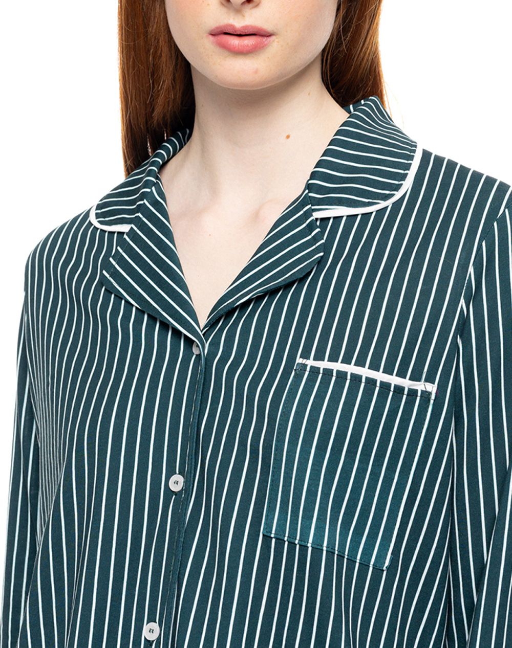 Γυναικείο σετ πυτζάμες, με μακρυμάνικη μπλούζα, με ριγέ μοτίβο, τσέπη στο στήθος και κλείσιμο με κουμπιά και ασορτί μακρύ παντελόνι. (Σύνθεση: 100% Βαμβάκι)