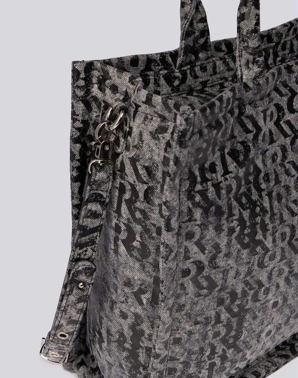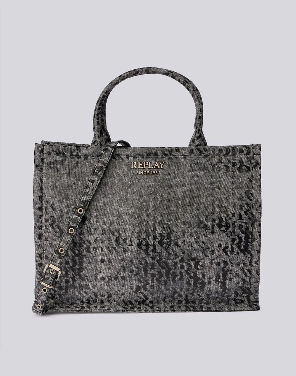 Γυναικεία τζιν τσάντα, με all over print μονόγραμμα, διπλή λαβή στο πάνω μέρος και ρυθμιζόμενο και αφαιρούμενο λουράκι ώμου και κλείσιμο με φερμουάρ. Διαστάσεις: 40 x 31 x 15εκ. (Σύνθεση: 100% Βαμβάκι & 100% Πολυεστέρας)