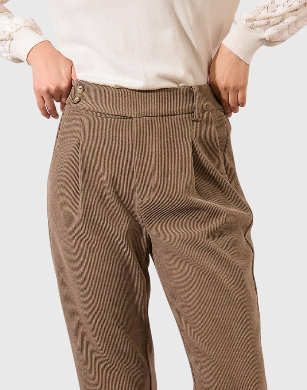 Γυναικείο παντελόνι, μονόχρωμο, ψηλόμεσο, σε carrot fit, με ελαστική πίσω μέση, πλαινές τσέπες, κλείσιμο με φερμουάρ και ασύμμετρο κουμπί στο πλάι της μέσης.(Σύνθεση: 95% Πολυεστέρας, 5% Ελαστάνη)