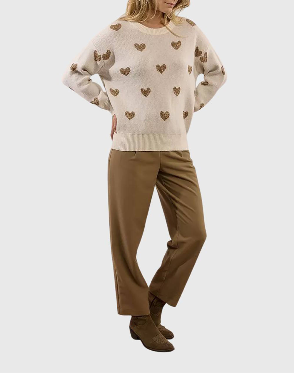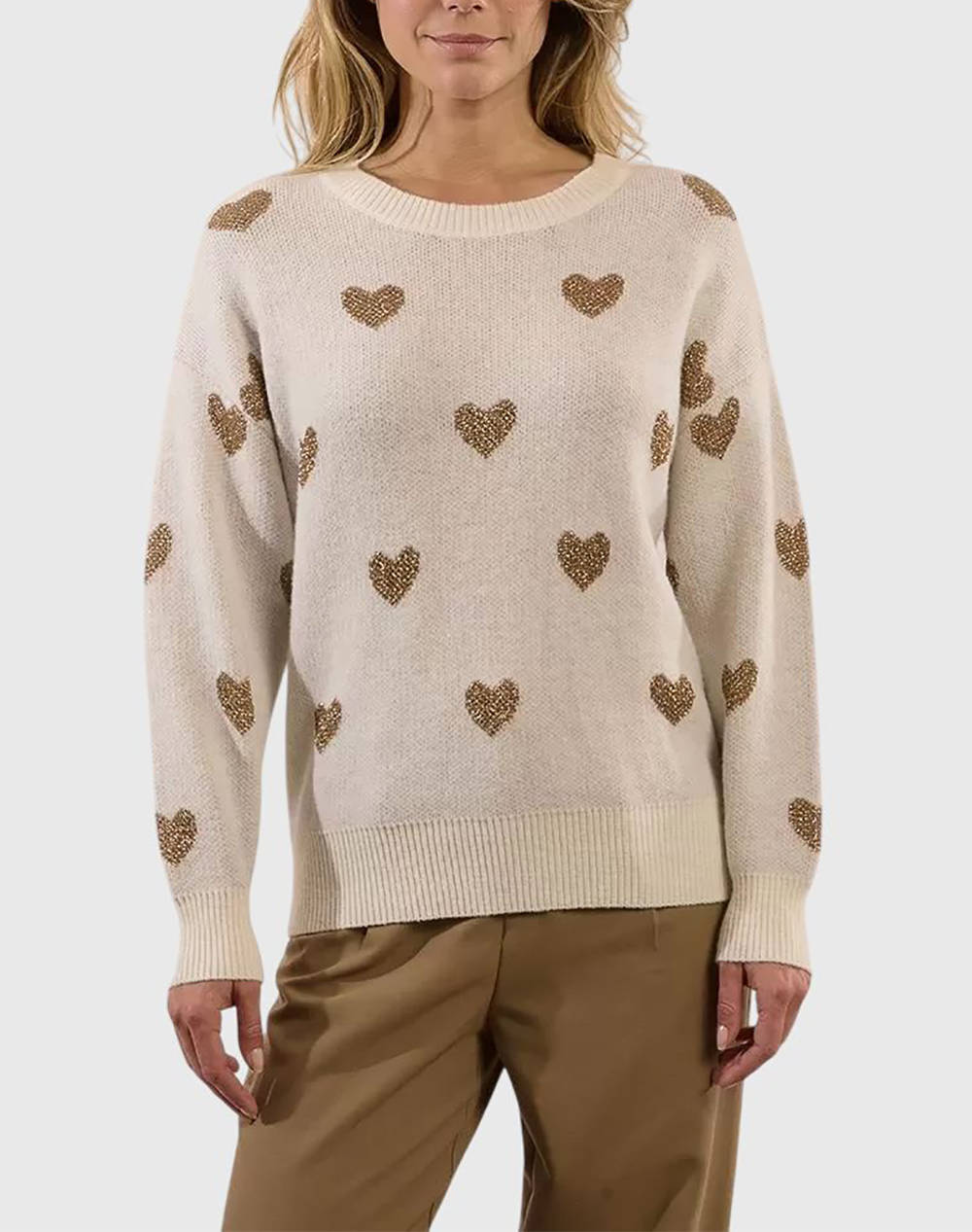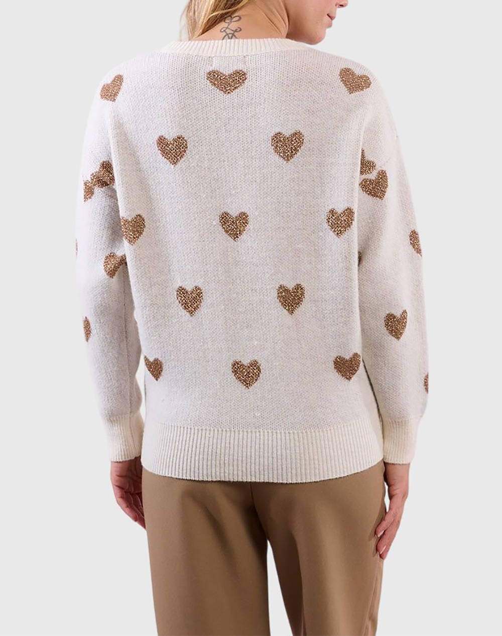 Γυναικεία πλεκτή μπλούζα, σε κανονική γραμμή, μακρυμάνικη, με καρδιές σε ολή την επιφάνεια και στρογγυλή λαιμόκοψη. (Σύνθεση: 38% Ακρυλικό, 37% Πολυεστέρας, 25% Πολυαμίδιο)