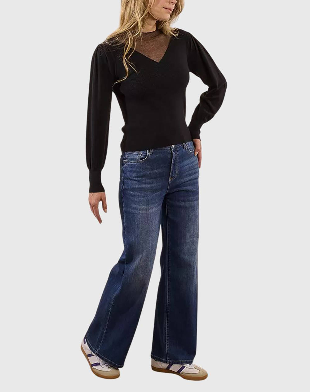 Γυναικείο πλεκτό πουλόβερ, σε στενή γραμμή, μακρυμάνικο, με V λαιμόκοψη και ημίψηλο γιακά σε ημιδιαφάνεια. (Σύνθεση: 51% Βισκόζη, 30% Πολυεστέρας, 19% Πολυαμίδιο)