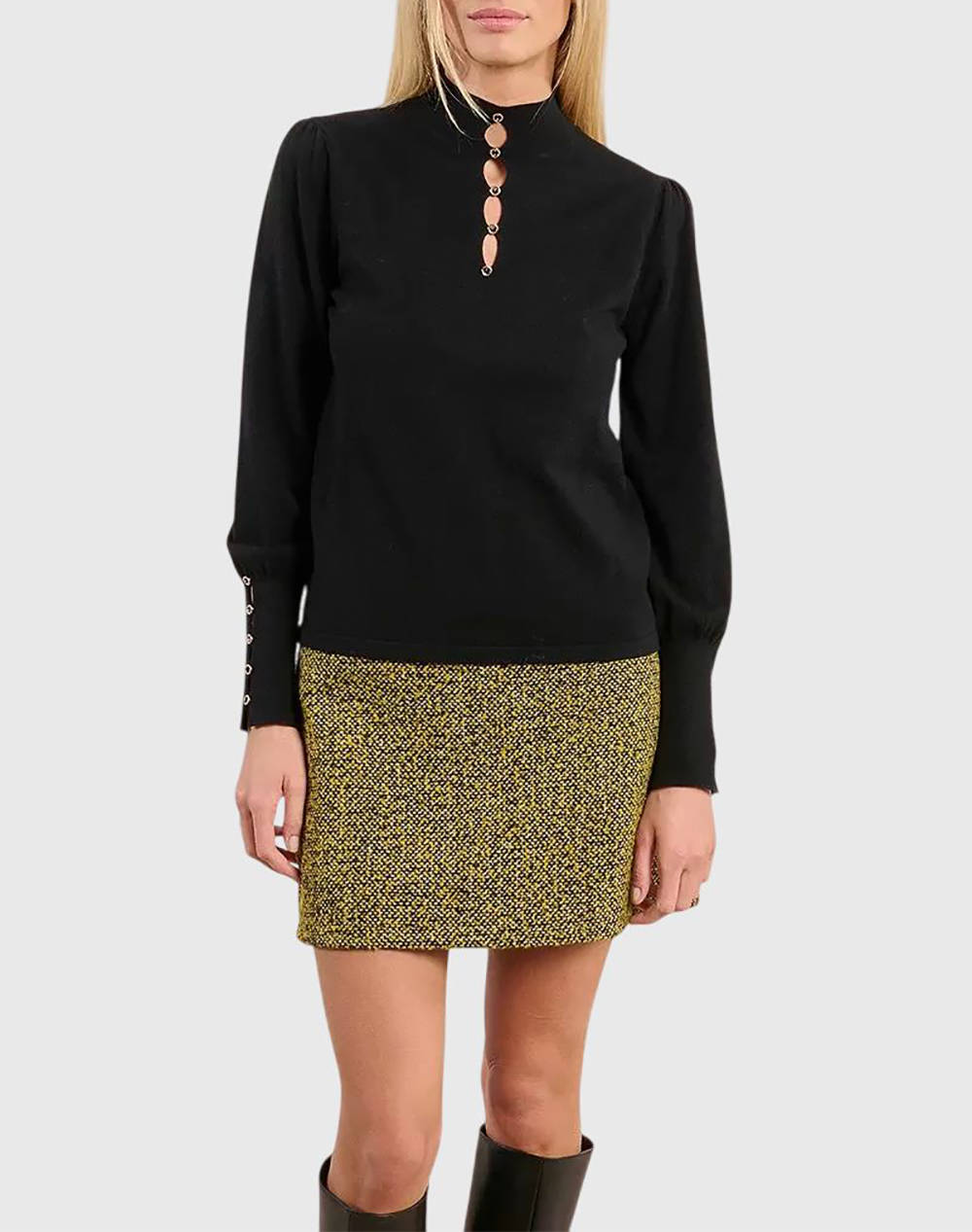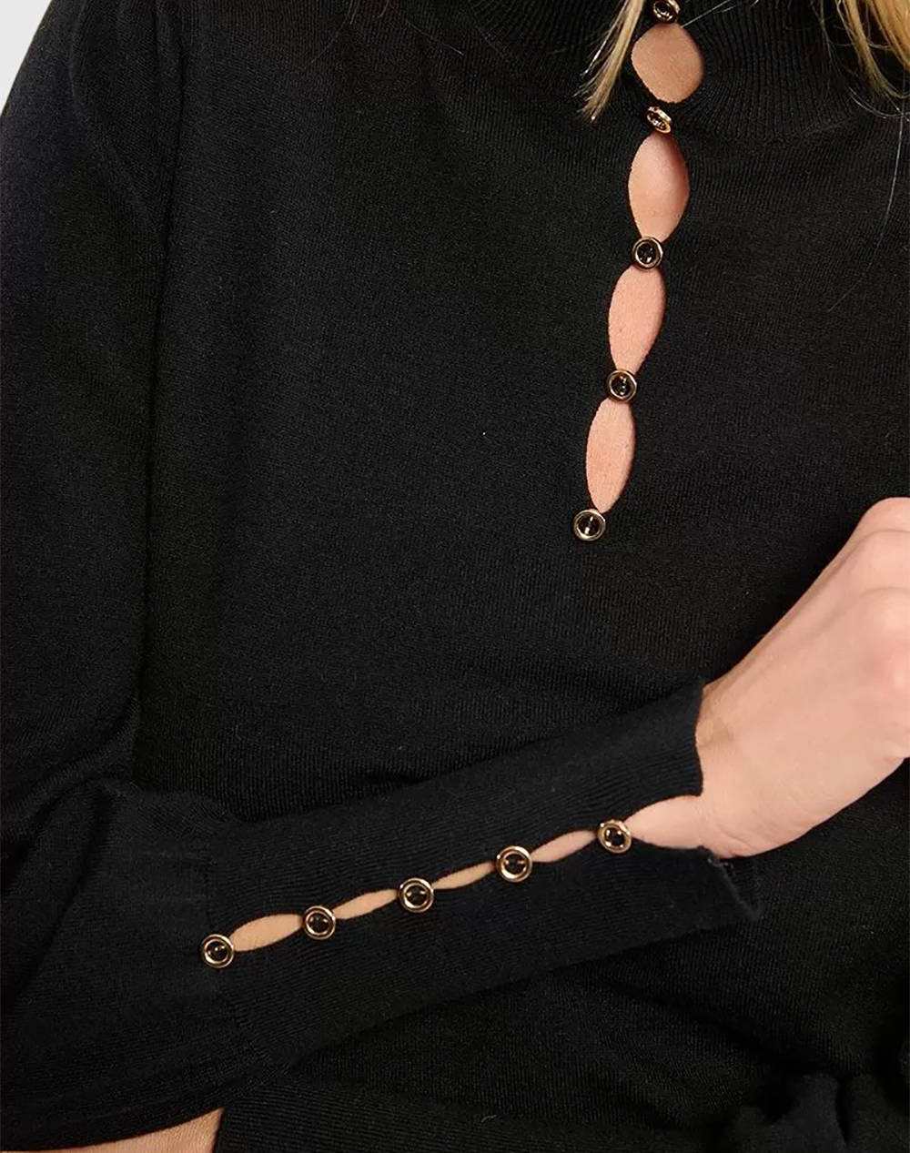 Γυναικεία πλεκτή μπλούζα, σε κανονική γραμμή, μακρυμάνικη, με άνοιγμα στη λαιμόκοψη και χάντρες στα μανίκια. (Σύνθεση: 51% Βισκόζη, 30% Πολυεστέρας, 19% Πολυαμίδιο)
