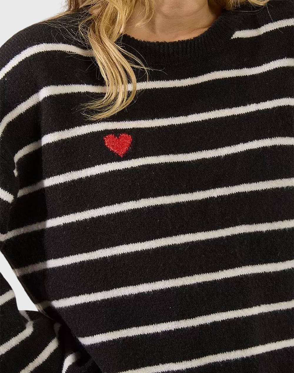 Γυναικείο πουλόβερ, σε κανονική γραμμή, ριγέ, μακρυμάνικο, με στρογγυλή λαιμόκοψη και πλεκτή καρδιά στο στήθος. (Σύνθεση: 74% Πολυεστέρας, 10% Ακρυλικό, 9% Πολυαμίδιο, 4% Μαλλί, 3% Ελαστάνη)