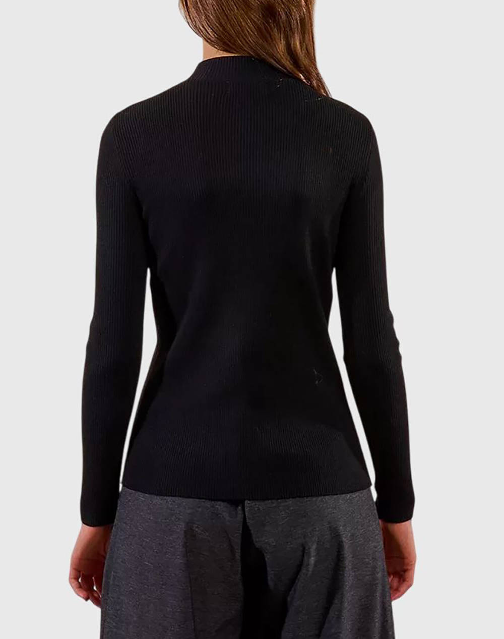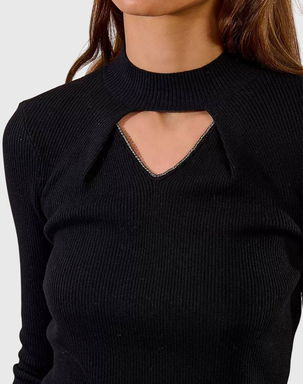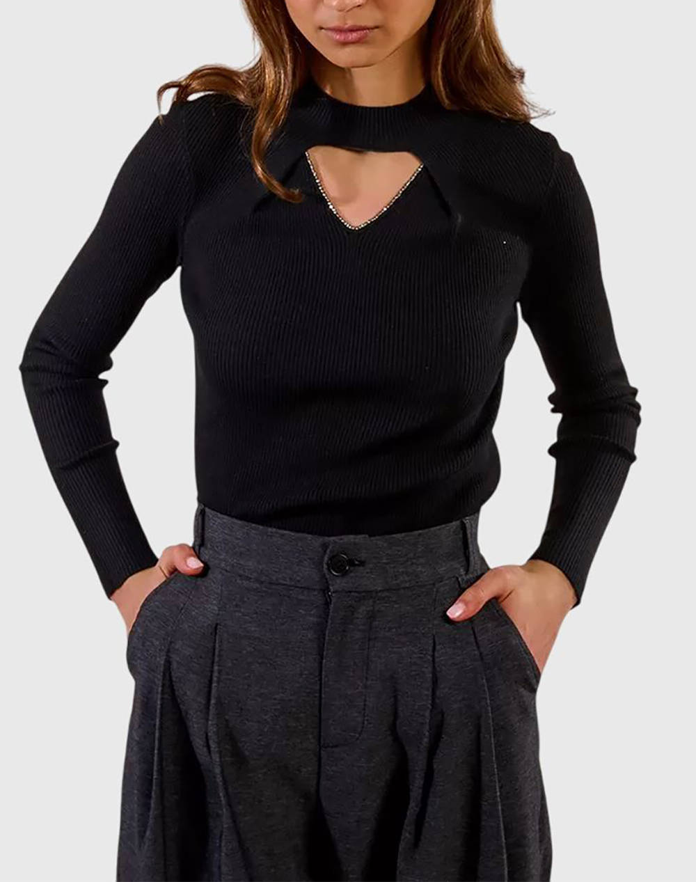 Γυναικείο πλεκτό πουλόβερ, σε στενή γραμμή, μακρυμάνικο, με ημίψηλο γιακά με άνοιγμα με στρας στο μπροστινό μέρος. (Σύνθεση: 49% Πολυεστέρας, 33% Πολυαμίδιο, 14% Ακρυλικό, 4% Μαλλί)