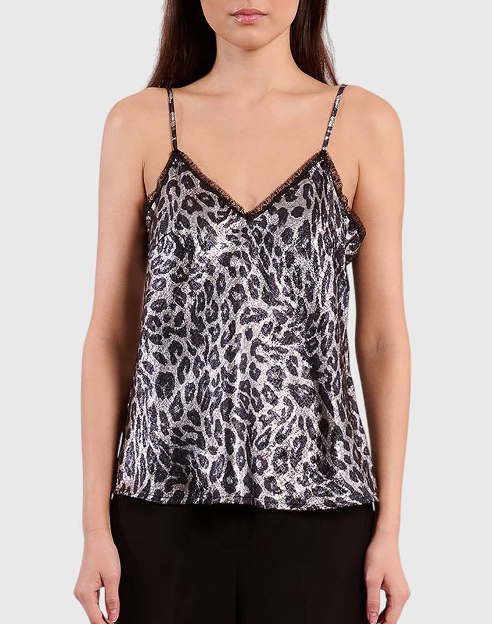 Γυναικείο τοπ, σε ίσια γραμμή, με λεοπάρ τύπωμα, "V" λαιμόκοψη και λεπτές ρυθμιζόμενες τιράντες. (Σύνθεση: 100% Πολυεστέρας)