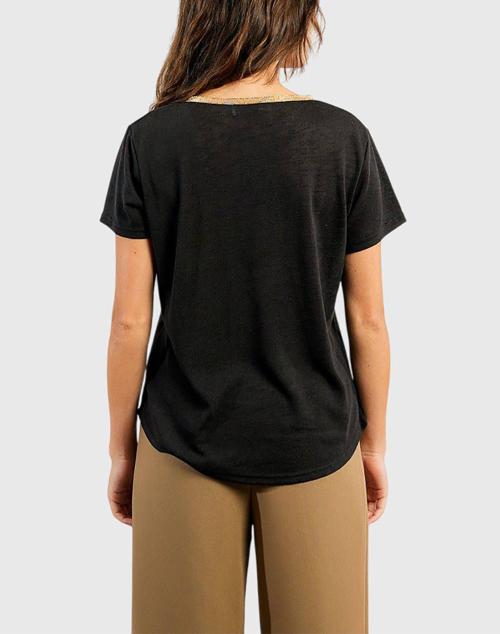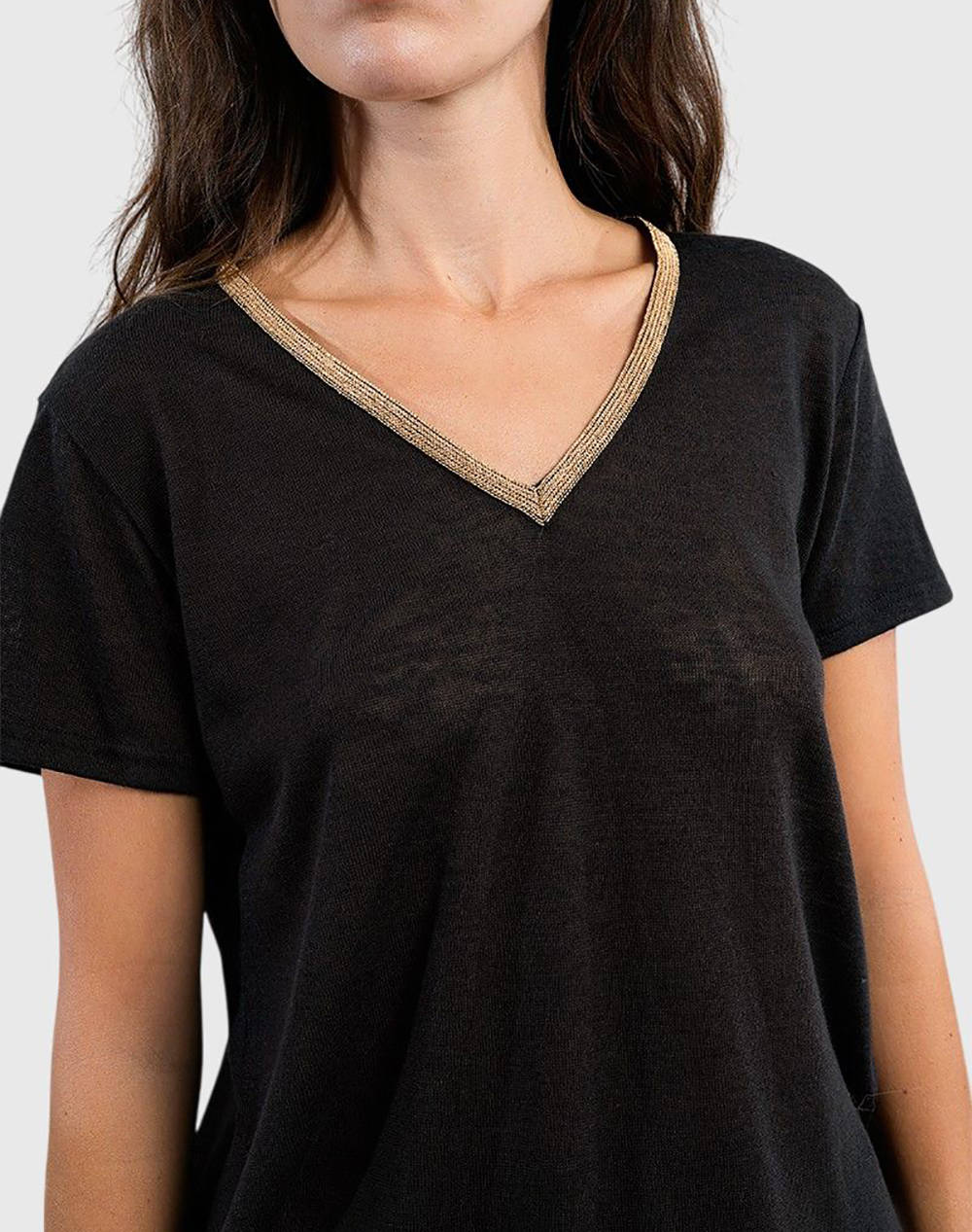 Γυναικείο τοπ, σε ίσια γραμμή, μονόχρωμο, κοντομάνικο, με "V" λαιμόκοψη και χρυσή λεπτομέρεια. (Σύνθεση: 100% Πολυεστέρας)