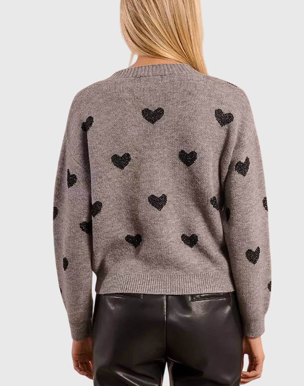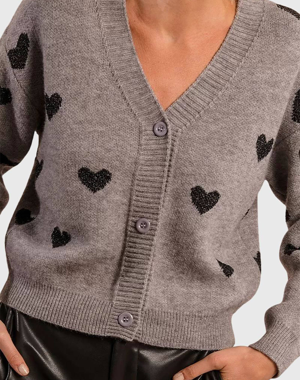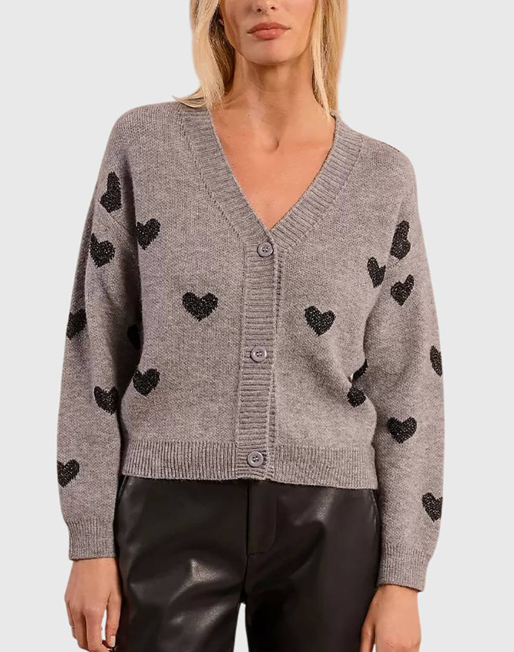 Γυναικεία πλεκτή ζακέτα, σε κανονική ίσια γραμμή, με V λαιμόκοψη, σχέδια καρδιάς σε όλη την επιφάνεια και κλείσιμο με κουμπιά μπροστά. (Σύνθεση: 38% Ακρυλικό,37% Πολυεστέρας, 25% Πολυαμίδιο)