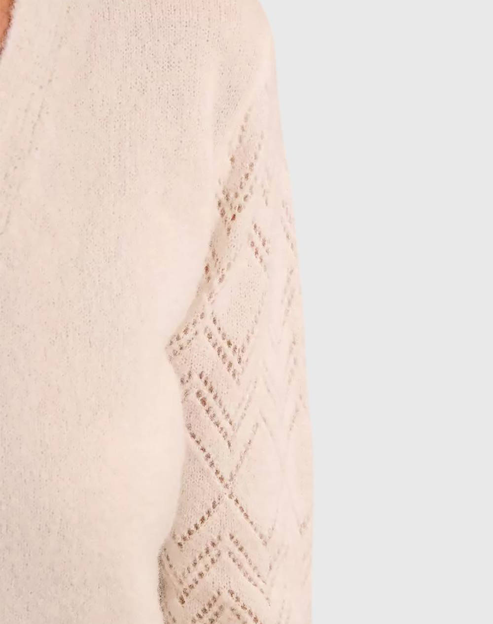 Γυναικεία πλεκτή ζακέτα, σε στενή γραμμή, με"V" λαιμόκοψη, μακριά μανίκια με διάτρητο σχέδιο και κλείσιμο με κουμπιά. (Σύνθεση: 54% Πολυεστέρας, 38% Ακρυλικό, 5% Μαλλί, 3% Ελαστάνη)