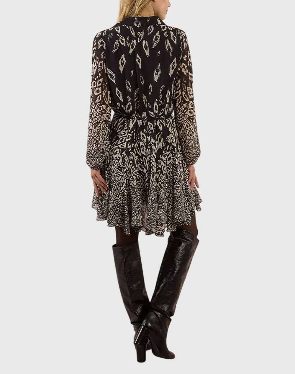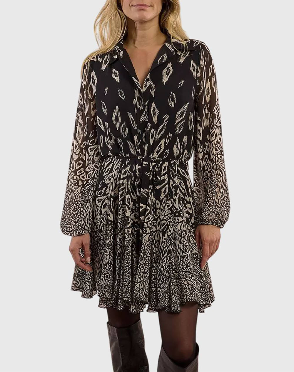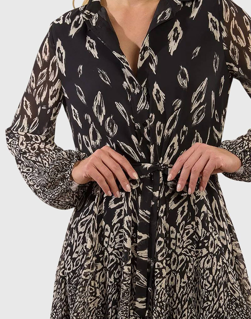 Γυναικείο μίνι φόρεμα, σε κανονική γραμμή, μακρυμάνικο, με εμπριμέ μοτίβο, γιακά πουκαμίσου, κουμπιά κατά μήκος μπροστά και ασορτί ζώνη.(Σύνθεση: 100% Πολυεστέρας)