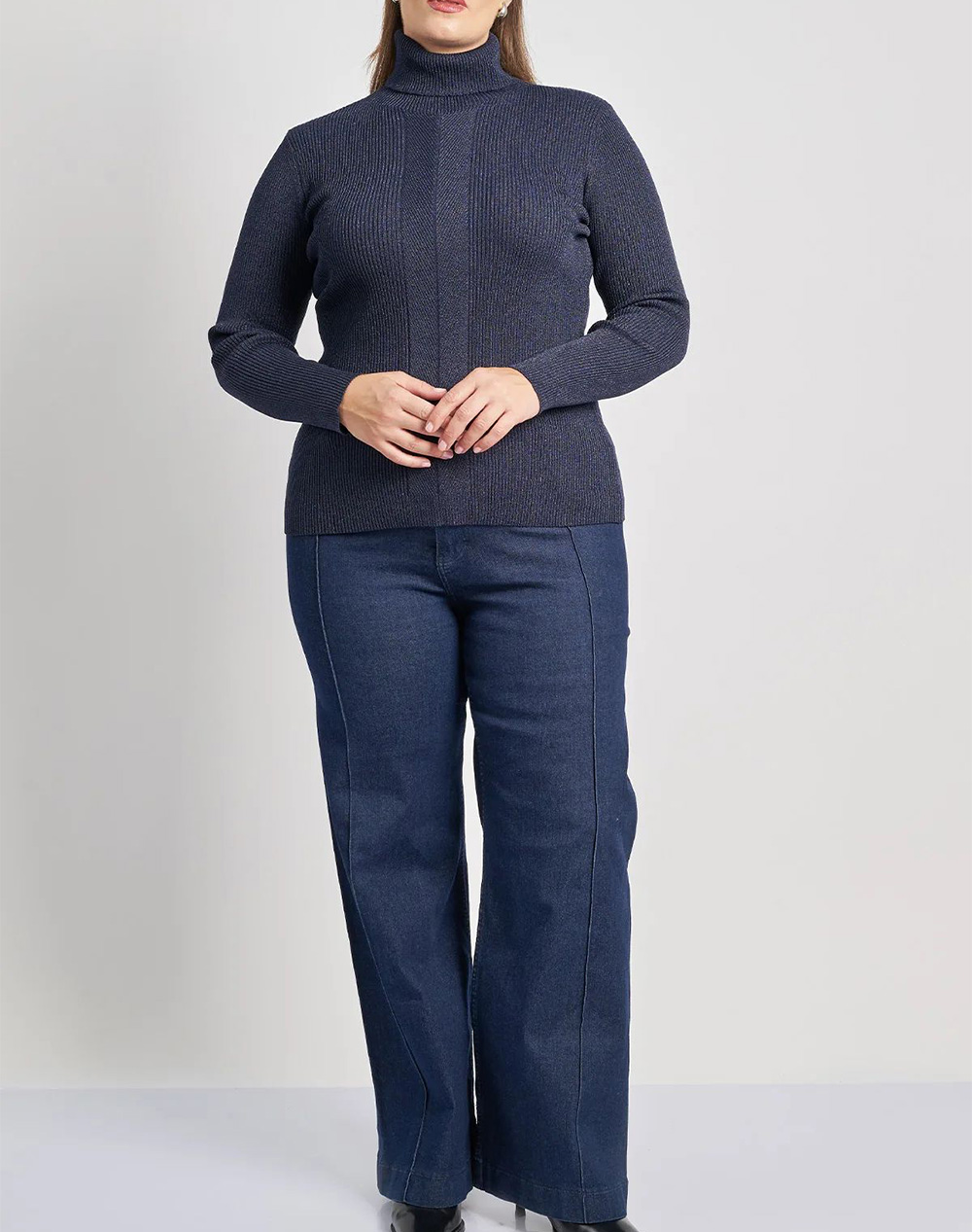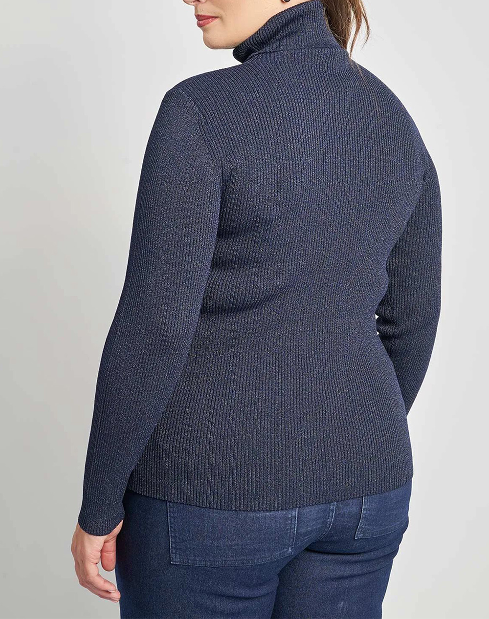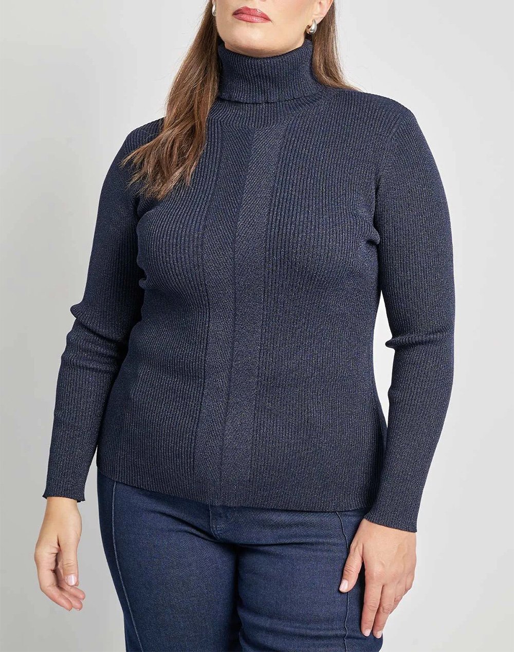 Γυναικεία πλεκτή μπλούζα, σε εφαρμοστή γραμμή, με ψηλό λαιμό, διακριτική λάμψη lurex και ανάγλυφη ριπ πλέξη. (Σύνθεση: 85% Βισκόζη, 15% Πολυεστέρας)