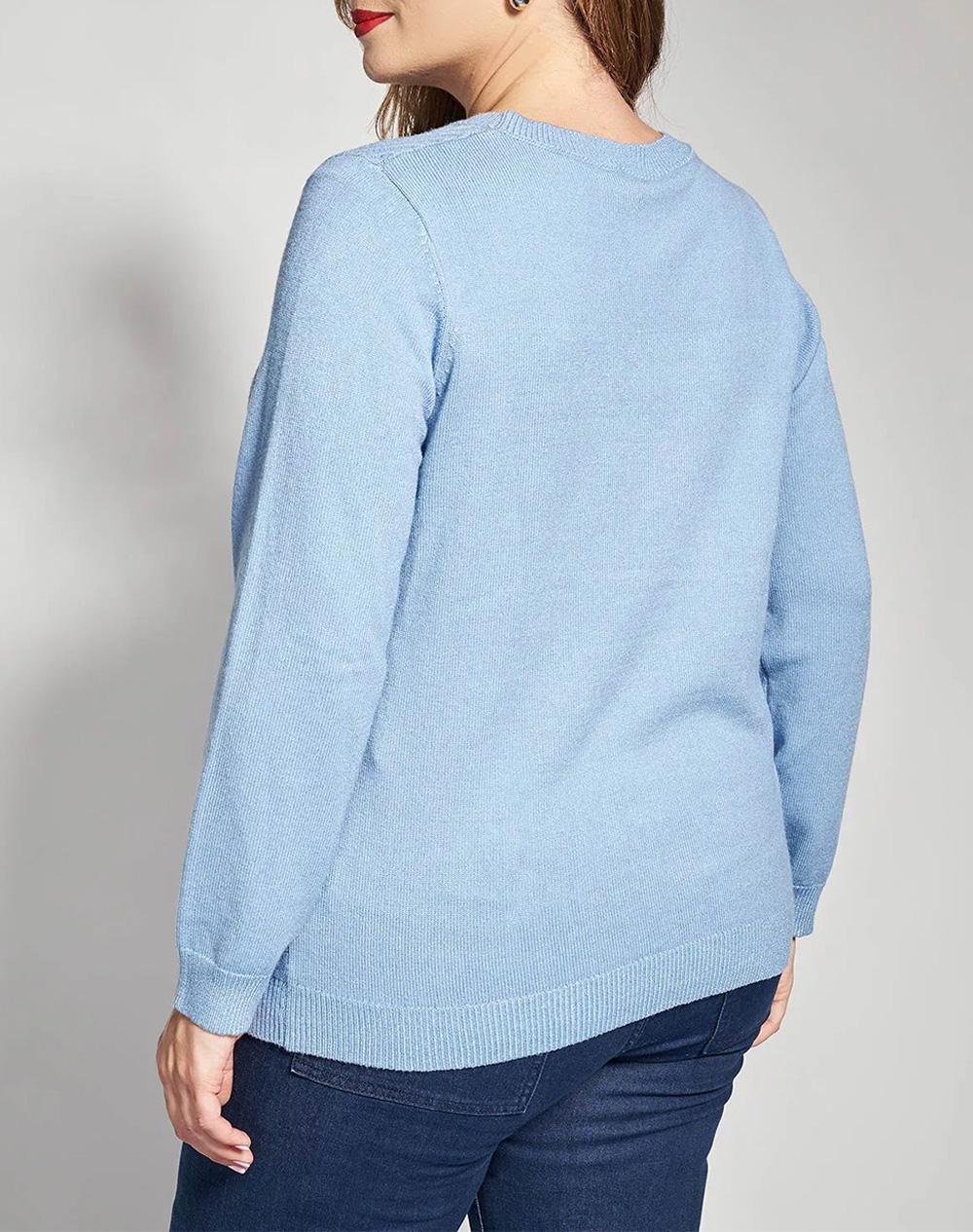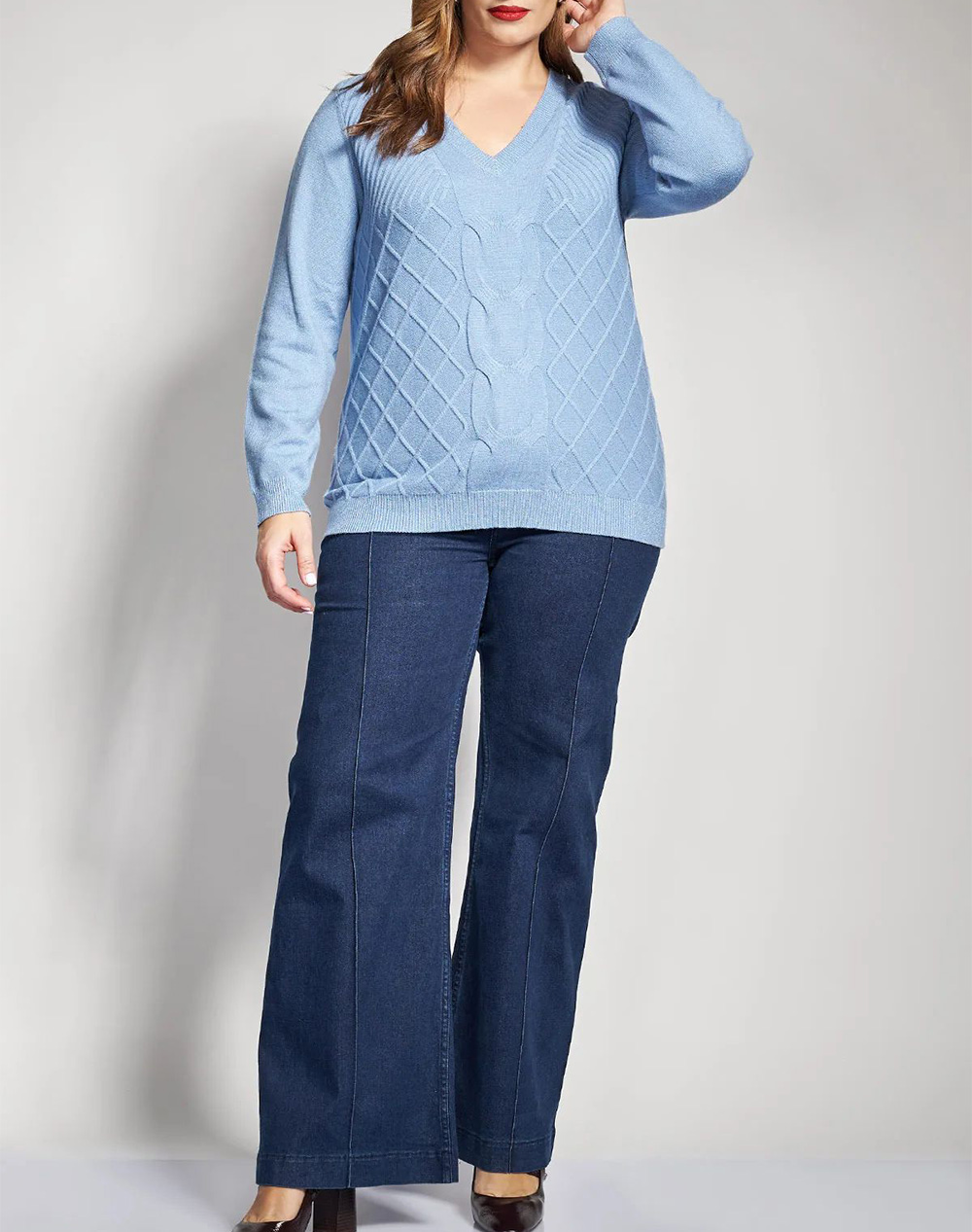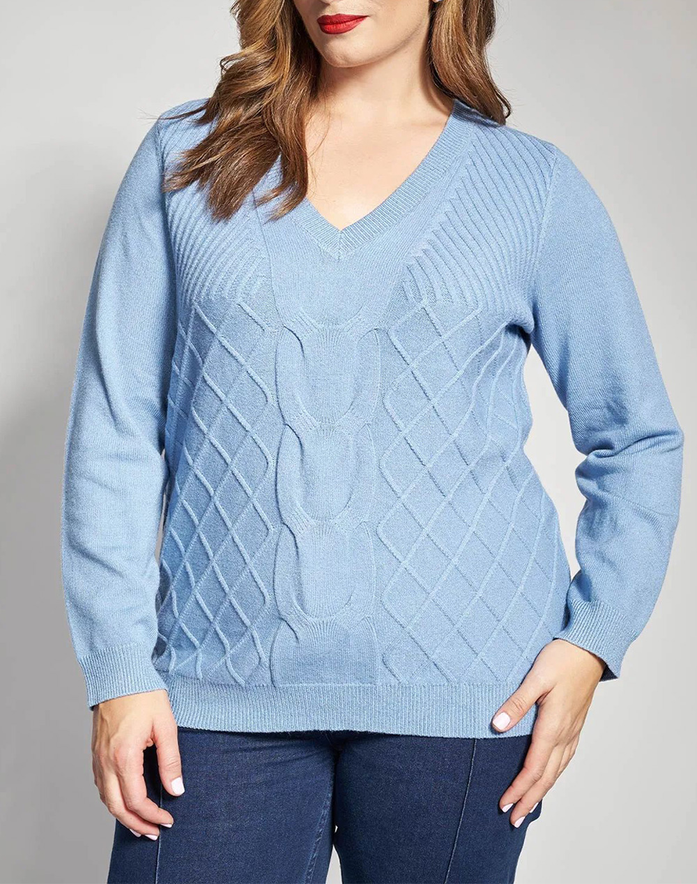 Γυναικεία πλεκτή μπλούζα, σε άνετη, ίσια γραμμή, μακρυμάνικη, με V λαιμόκοψη που καταλήγει σε σχέδιο πλεξούδα και ανάγλυφη πλέξη με λάμψη lurex. (Σύνθεση: 55% Βισκόζη, 40% Πολυαμίδιο, 3% Πολυεστέρας, 2% Μεταλλικές Ίνες)