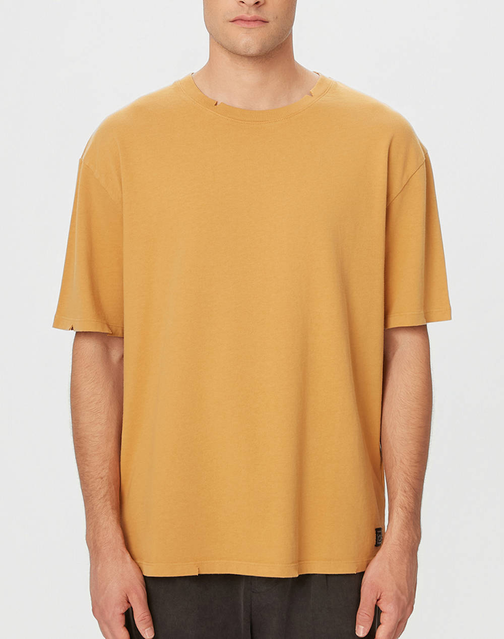Ανδρικό t-shirt, σε oversized γραμμή, κοντομάνικο, με στρογγυλή λαιμόκοψη και λεπτομέρειες με καταστροφές. (Σύνθεση: 100% Βαμβάκι)