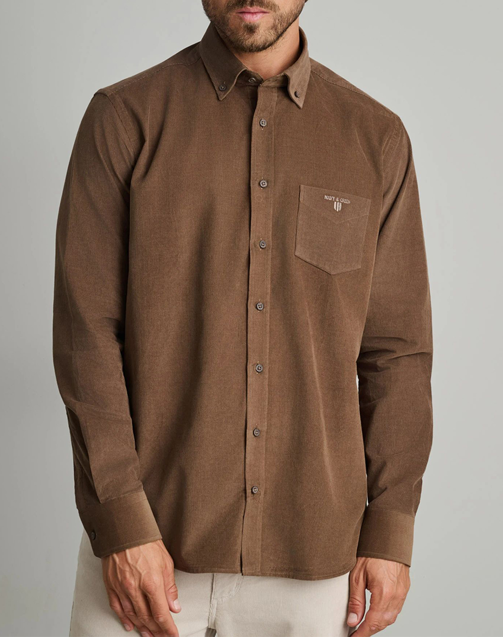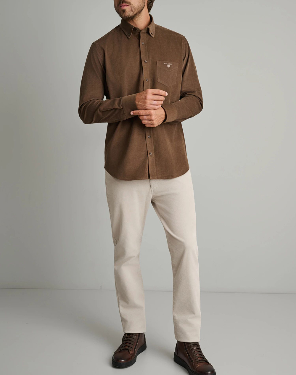 Ανδρικό πουκάμισο σε άνετη γραμμή, μονόχρωμο, μακρυμάνικο, με button down γιακά, τσέπη στο στήθος με λογότυπο και κλείσιμο με κουμπιά μπροστά. (Σύνθεση: 100% Βαμβάκι)
