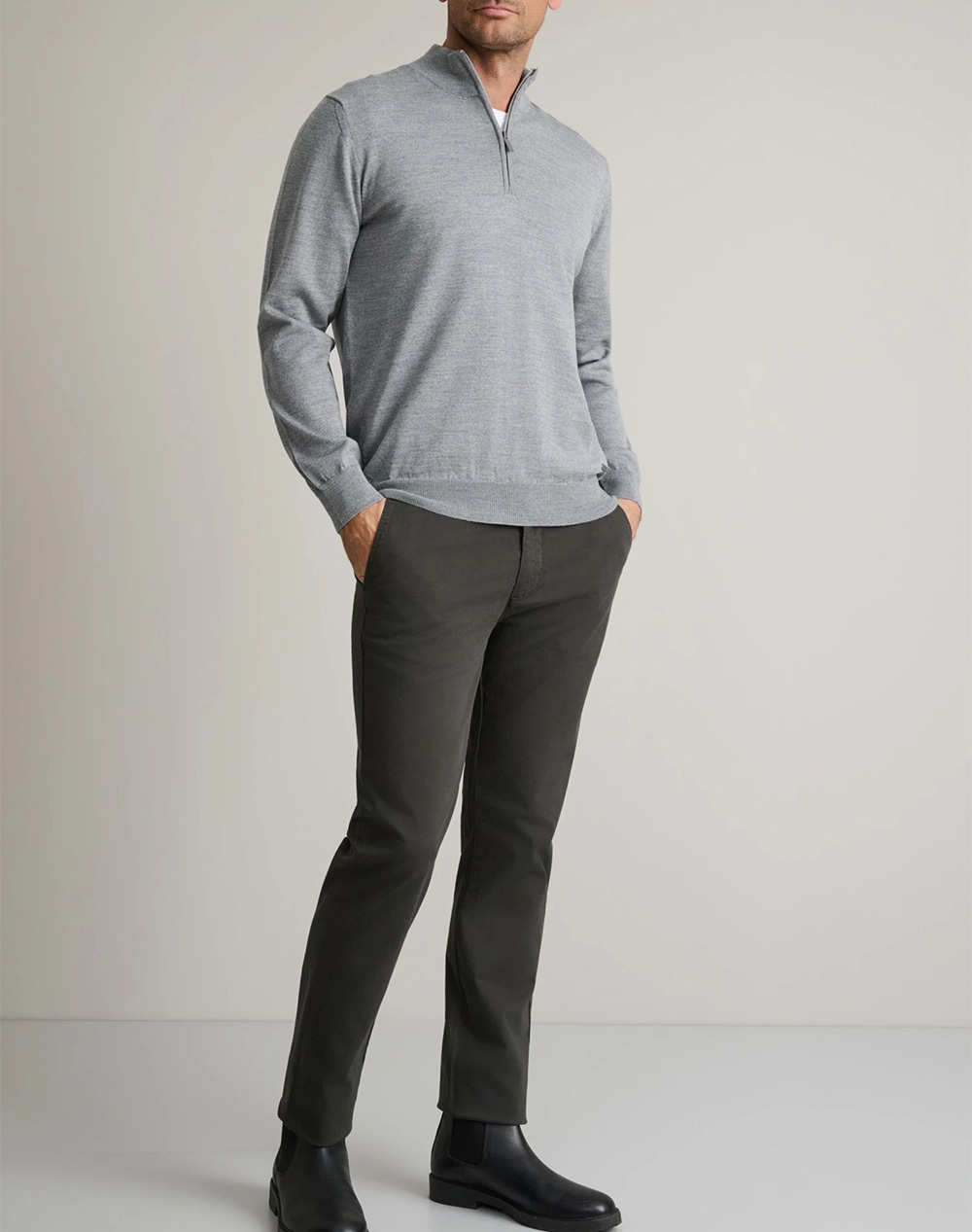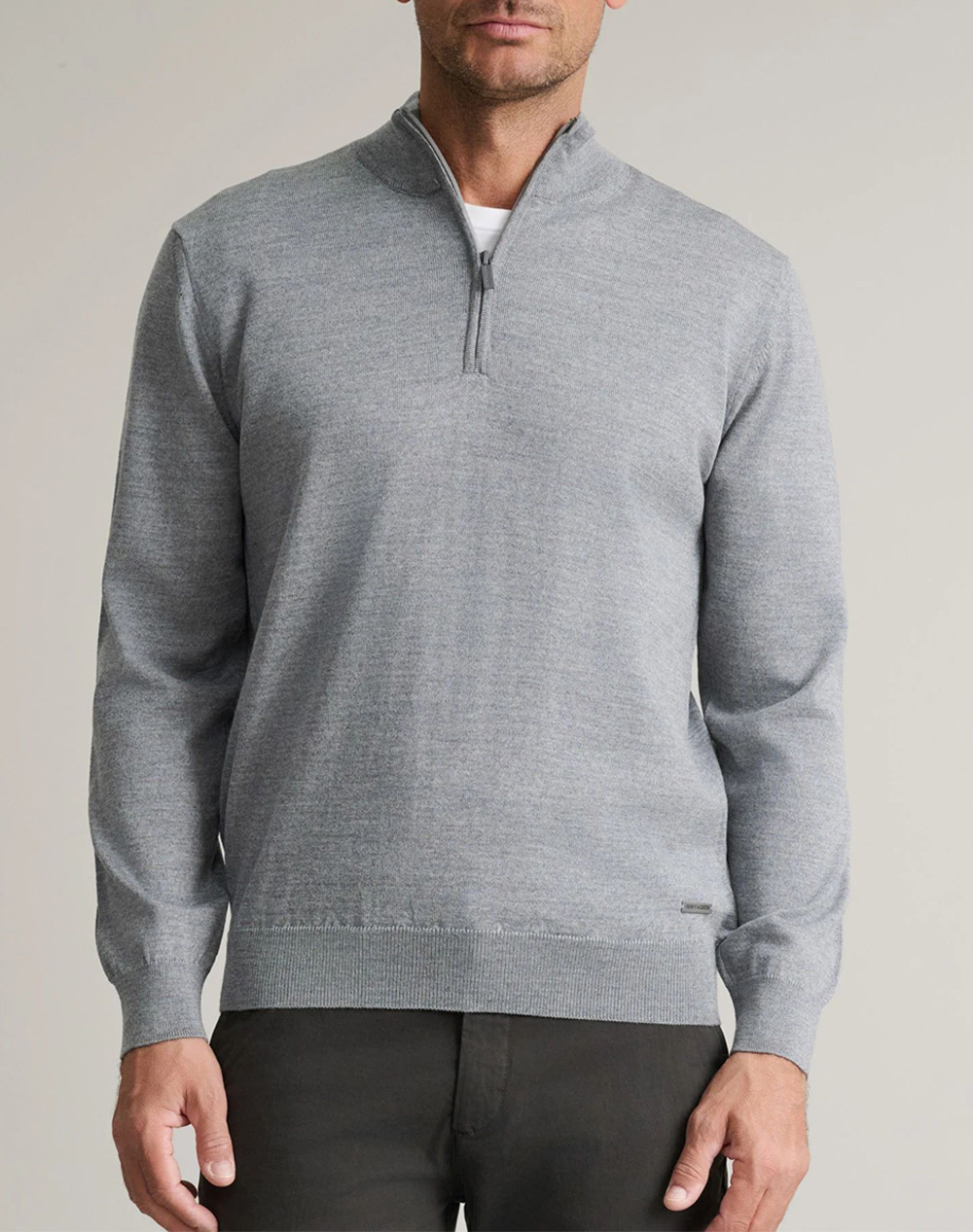 Ανδρική πλεκτή μπλούζα, σε κανονική γραμμή, μακρυμάνικη, με επεξεργασία cashmere wash και όρθιο γιακά με half zip. (Σύνθεση: 100% Μαλλί Μερινος)