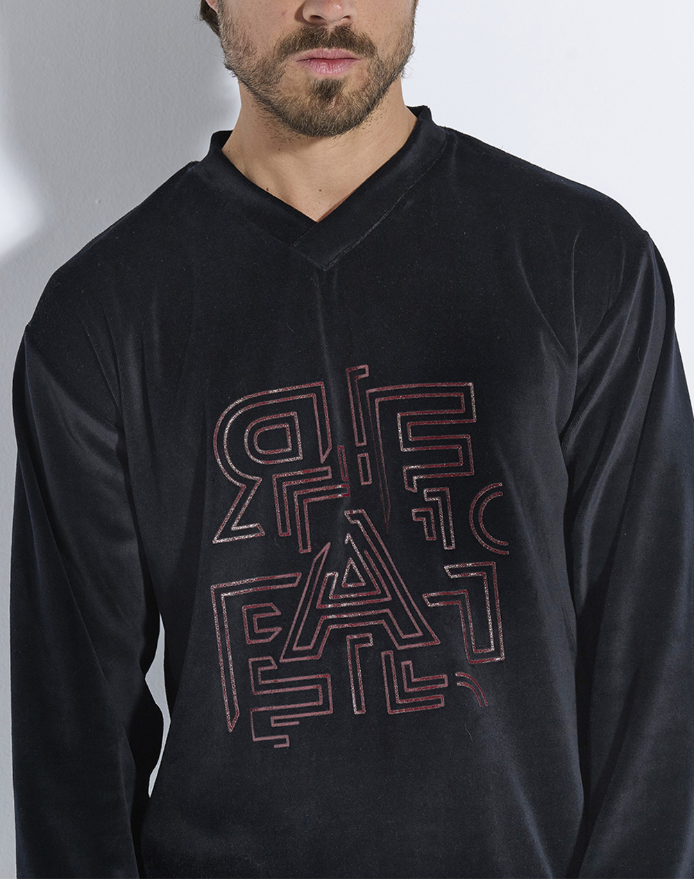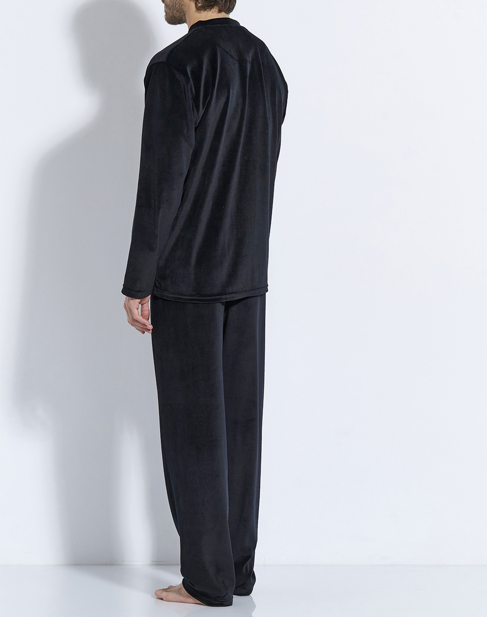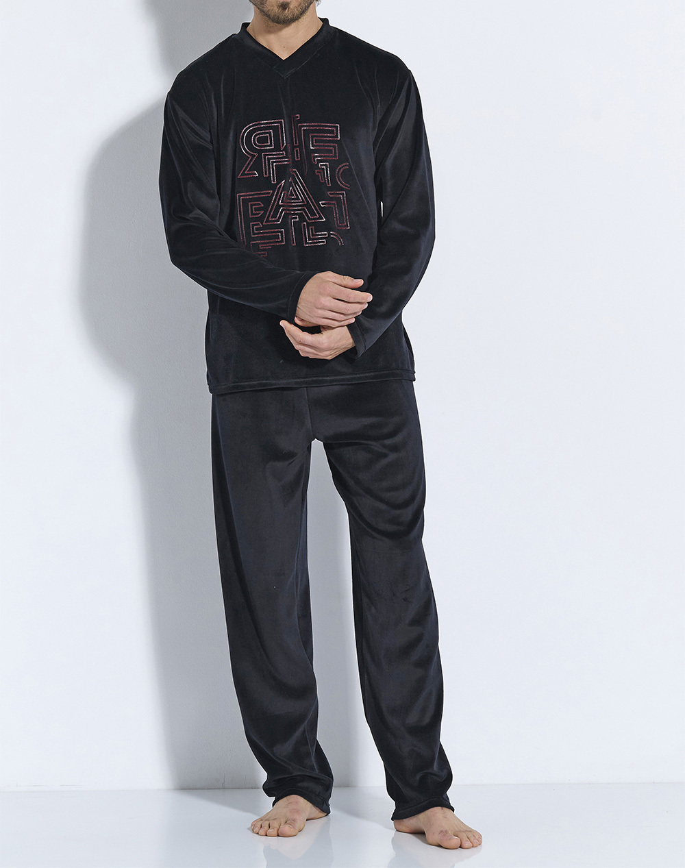 Σετ ανδρικές πυτζάμες, με μονόχρωμη, μακρυμάνικη μπλούζα, με βελουτέ υφή, τύπωμα μπροστά και ασορτί παντελόνι.(Σύνθεση: 80% Βαμβάκι, 20% Πολυεστέρας)