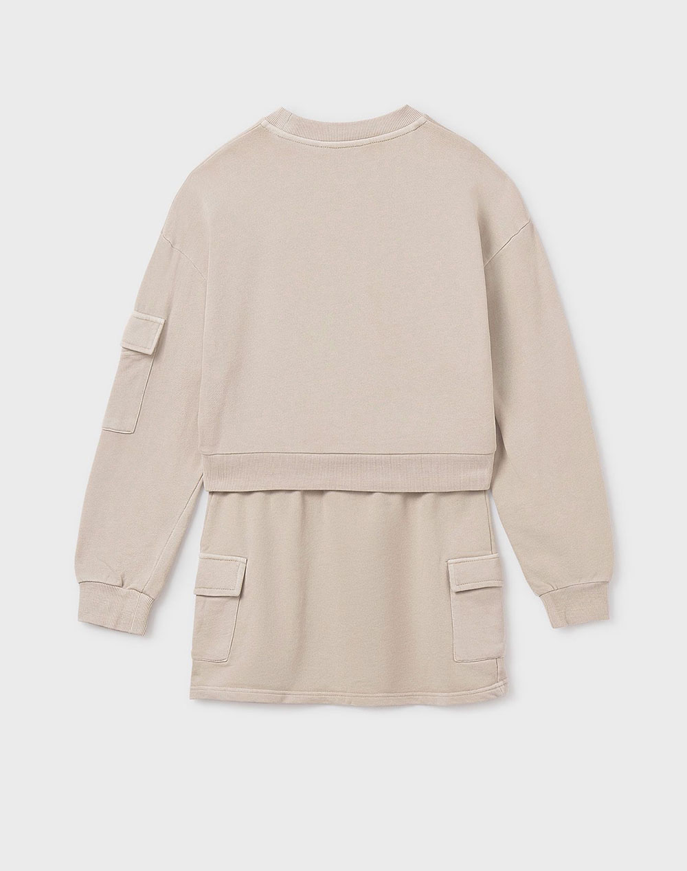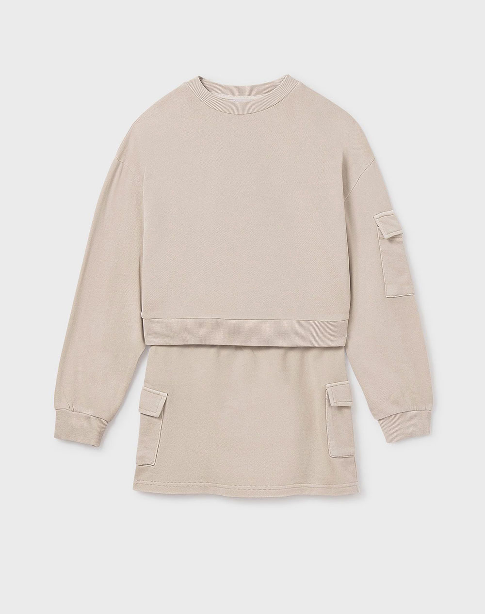 Παιδικό σετ, με μονόχρωμη, μακρυμάνικη μπλούζα, με στρογγυλή λαιμόκοψη και μονόχρωμη φούστα, με τσέπες τύπου cargo και ελαστική μέση με κορδόνι περίσφυξης. (Σύνθεση: 82% Βαμβακι, 17% Πολυεστερας, 1% Ελαστομερης πολυουρεθανη)