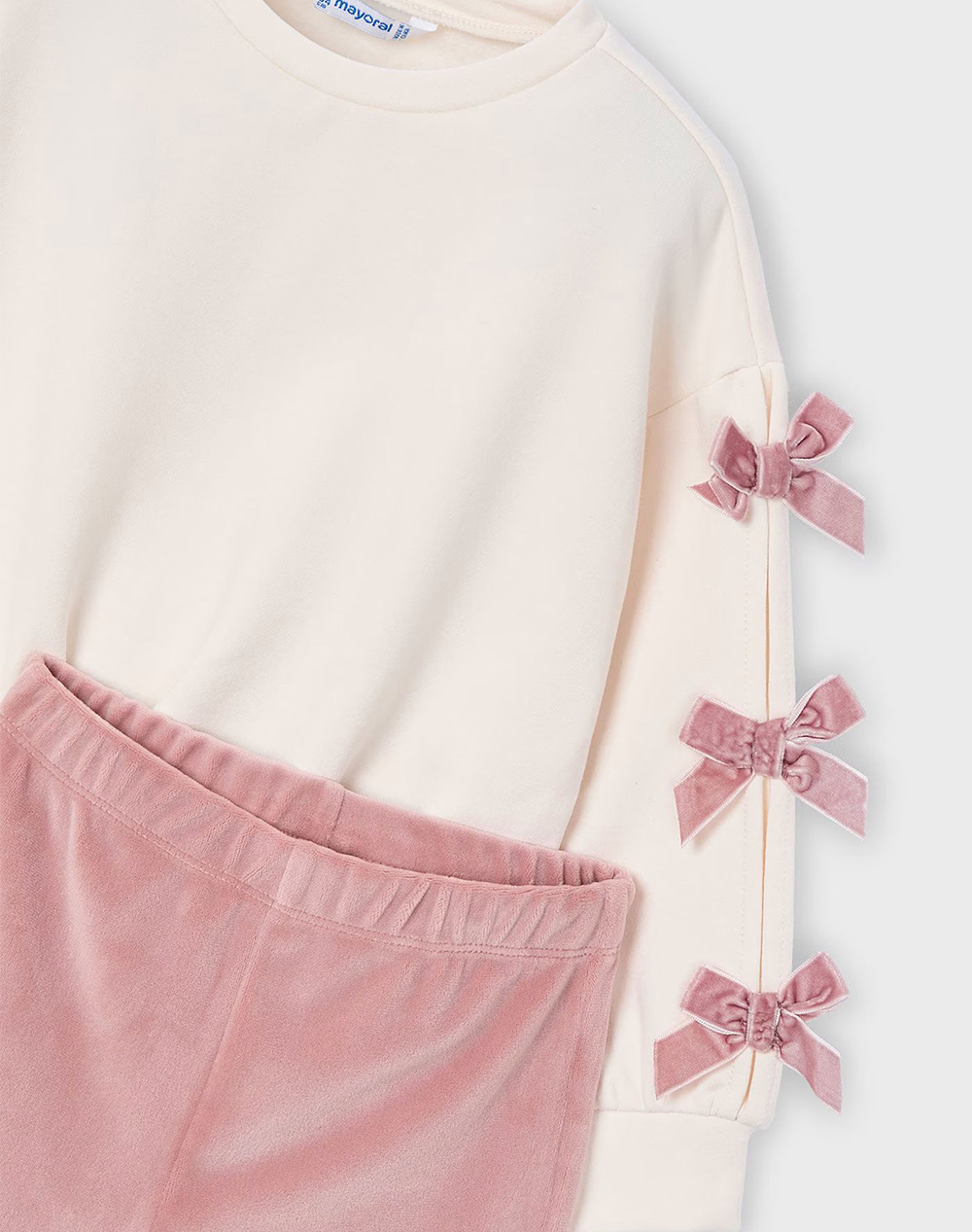 Παιδικό σετ, με μονόχρωμη, μακρυμάνικη μπλούζα, με στρογγυλή λαιμόκοψη και διακοσμητικούς φιόγκους και μονόχρωμο, βελουτέ παντελόνι, με ελαστική μέση. (Σύνθεση: 57% Βαμβάκι, 38% Πολυεστέρας, 5% Ελαστική πολυουρεθάνη & 95% Πολυεστέρας, 5% Ελαστάνη)