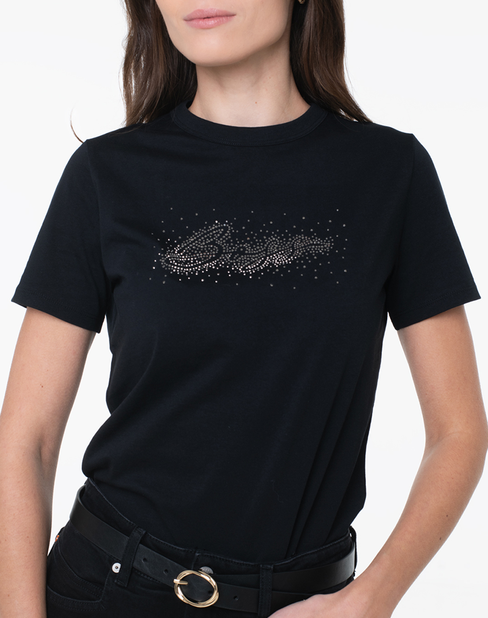 Γυναικείο t-shirt, σε στενή γραμμή, κοντομάνικο, με στρογγυλή λαιμόκοψη και strass λογότυπο μπροστά. (Σύνθεση: 100% Βαμβάκι)