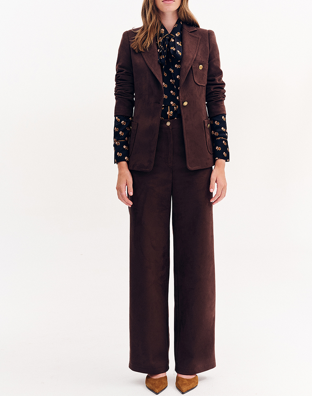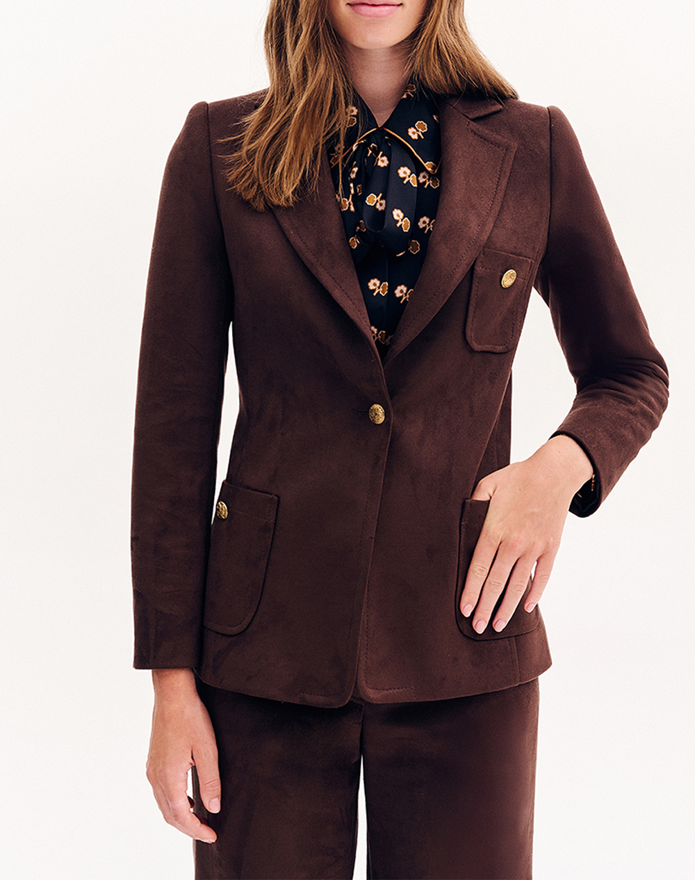 Γυναικείο σουέτ σακάκι, μεσάτο, μονόκουμπο, με γιακά πέτο και τετράγωνες τσέπες μπροστα με λεπτομέρεια χρυσά κουμπιά. (Σύνθεση: 94% Πολυεστέρας, 6% Ελαστάνη)