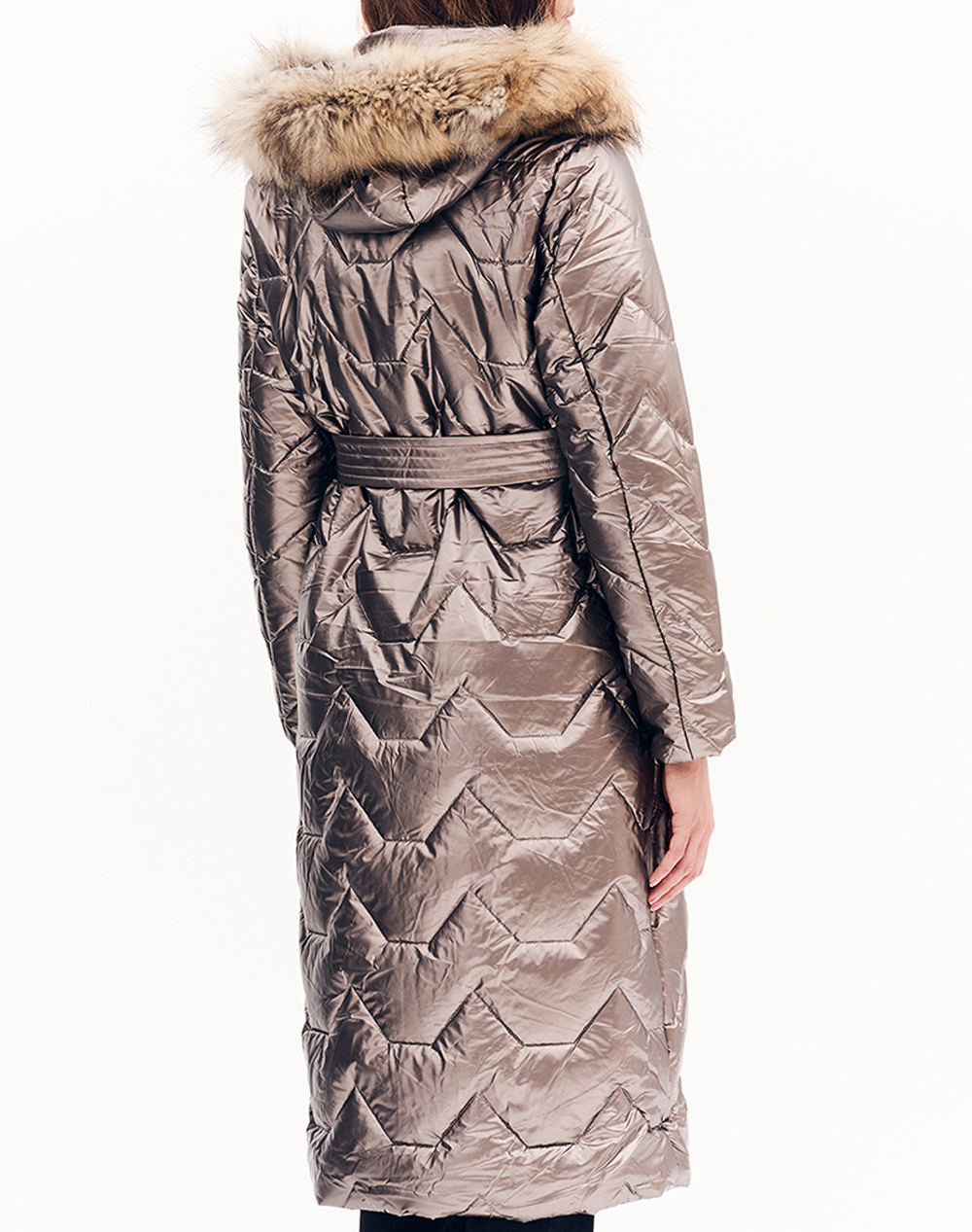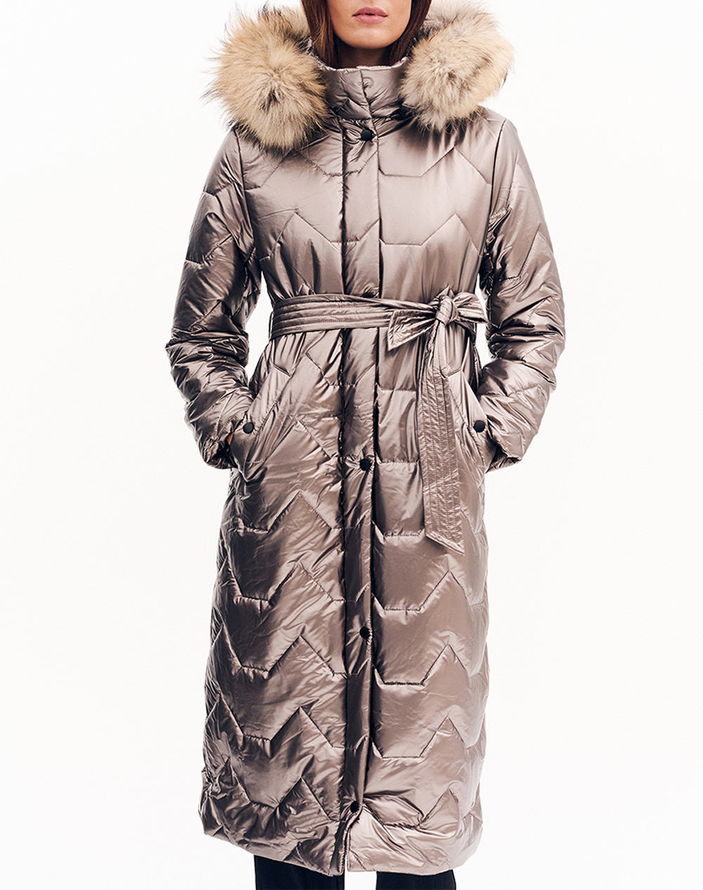 Γυναικείο μακρύ μπουφάν, με καπιτονέ σχέδιο, κουκούλα με αποσπώμενη αληθινή γούνα και κλείσιμο κατά μήκος με κουμπιά και φερμουάρ. Διαθέτει ζώνη ίδιας ύφανσης στη μέση. (Σύνθεση: 100% Πολυεστέρας)