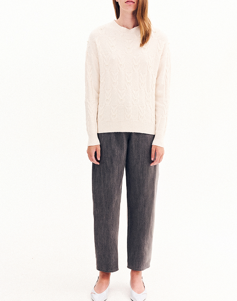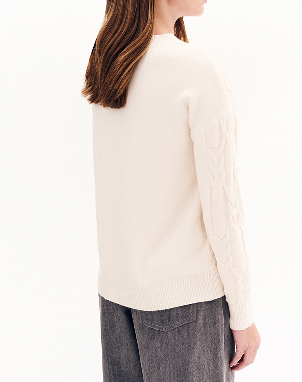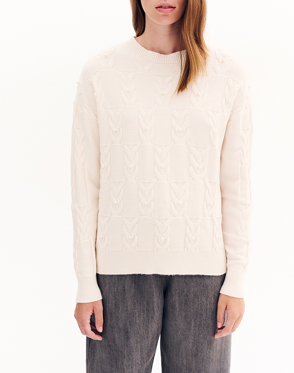 Γυναικείο πουλόβερ, μακρυμάνικο, με ανάγλυφη πλέξη, στρογγυλή λαιμόκοψη και λεπτομέρειες με πέρλες. (Σύνθεση: 56% Βισκόζη, 27% Πολυεστέρας, 17% Νάιλον)