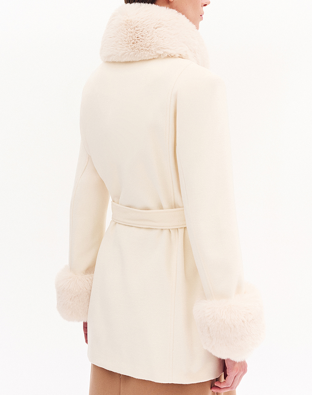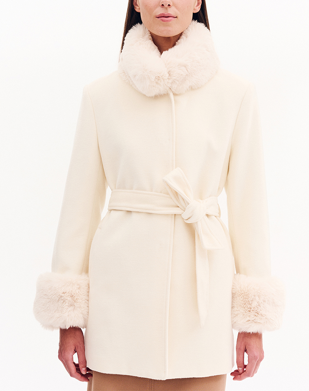Γυναικείο κοντό παλτό, με λεπτομέρεια αποσπώμενη γούνα στο γιακά και στις μανσέτες. Διαθέτει κοφτές τσέπες και ζώνη ίδιας ύφανσης στη μέση. (Σύνθεση: 90% Πολυεστέρας, 10% Μαλλί)