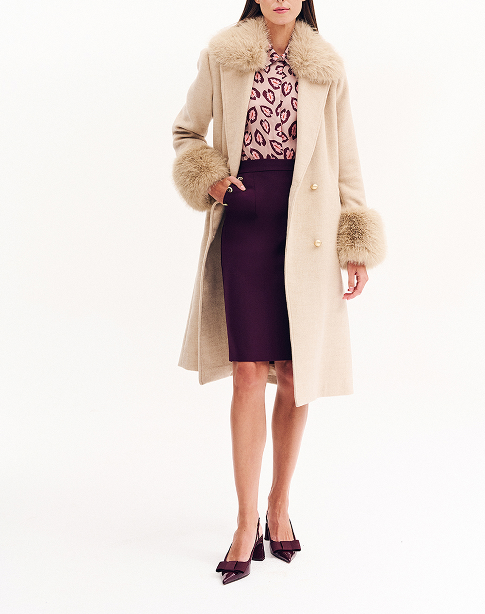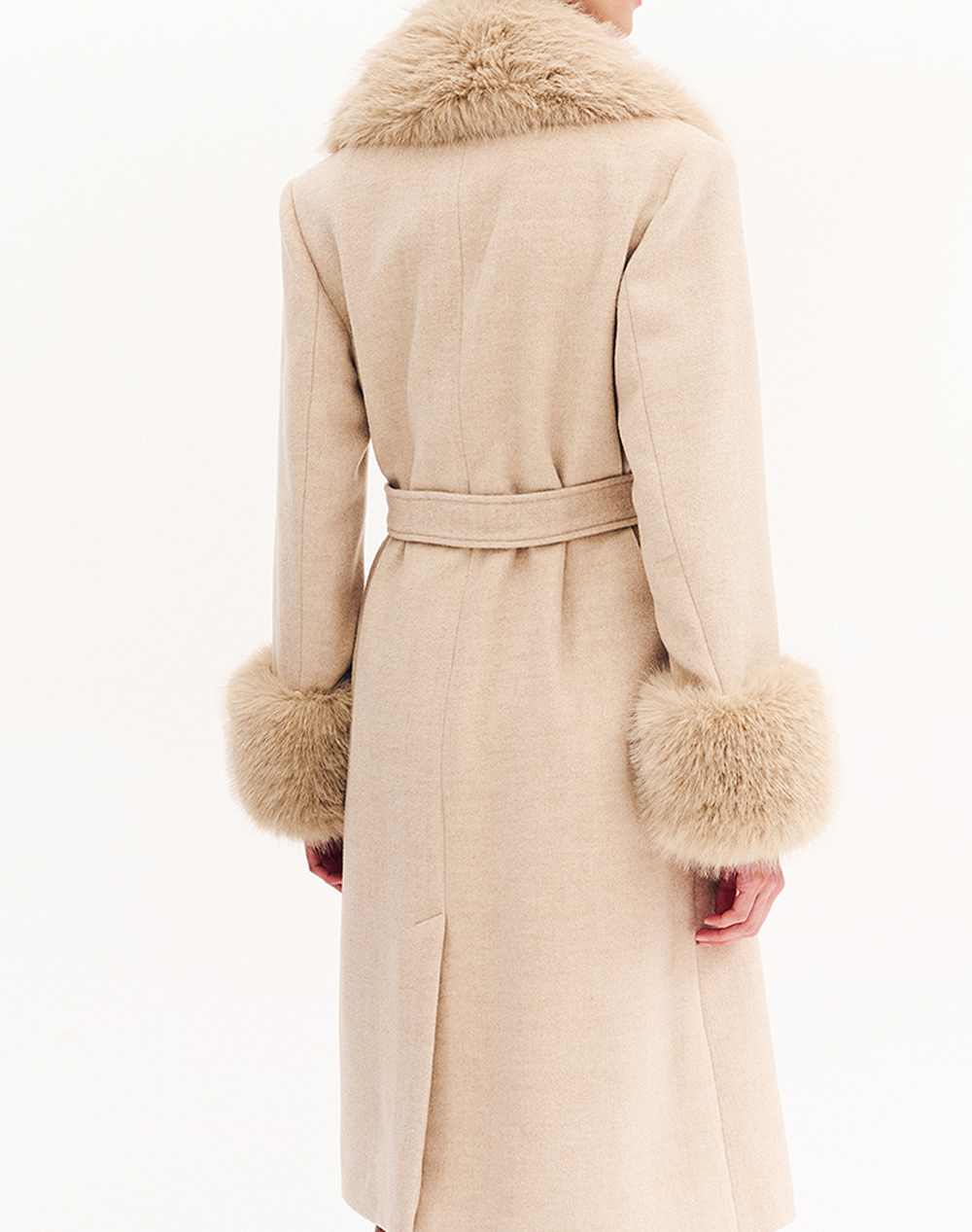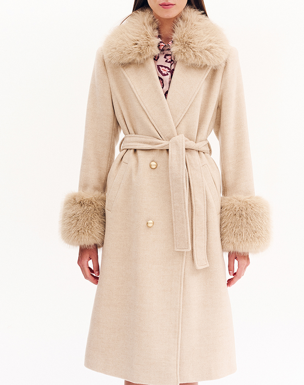 Γυναικείο μακρύ παλτό, με λεπτομέρεια αποσπώμενη γούνα στο γιακά και στις μανσέτες. Διαθέτει κοφτές τσέπες και ζώνη ίδιας ύφανσης στη μέση. (Σύνθεση: 70% Πολυεστέρας, 30% Μαλλί)