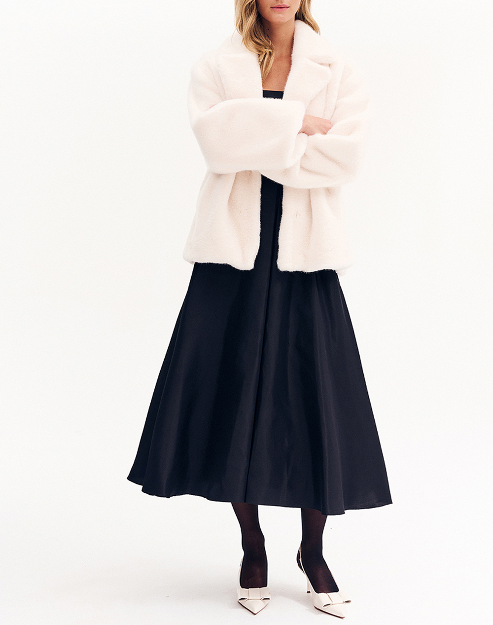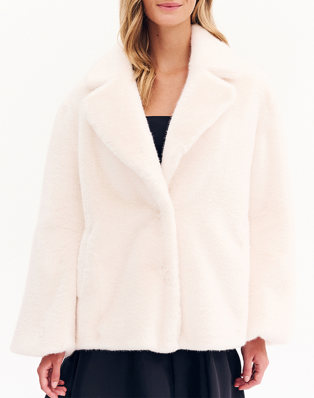 Γυναικείο γούνινο πανωφόρι, σε άνετη γραμμή, με γιακά πέτο, πλαϊνές τσέπες και κλείσιμο μπροστά με κουμπιά. (Σύνθεση: 100% Πολυεστέρας)