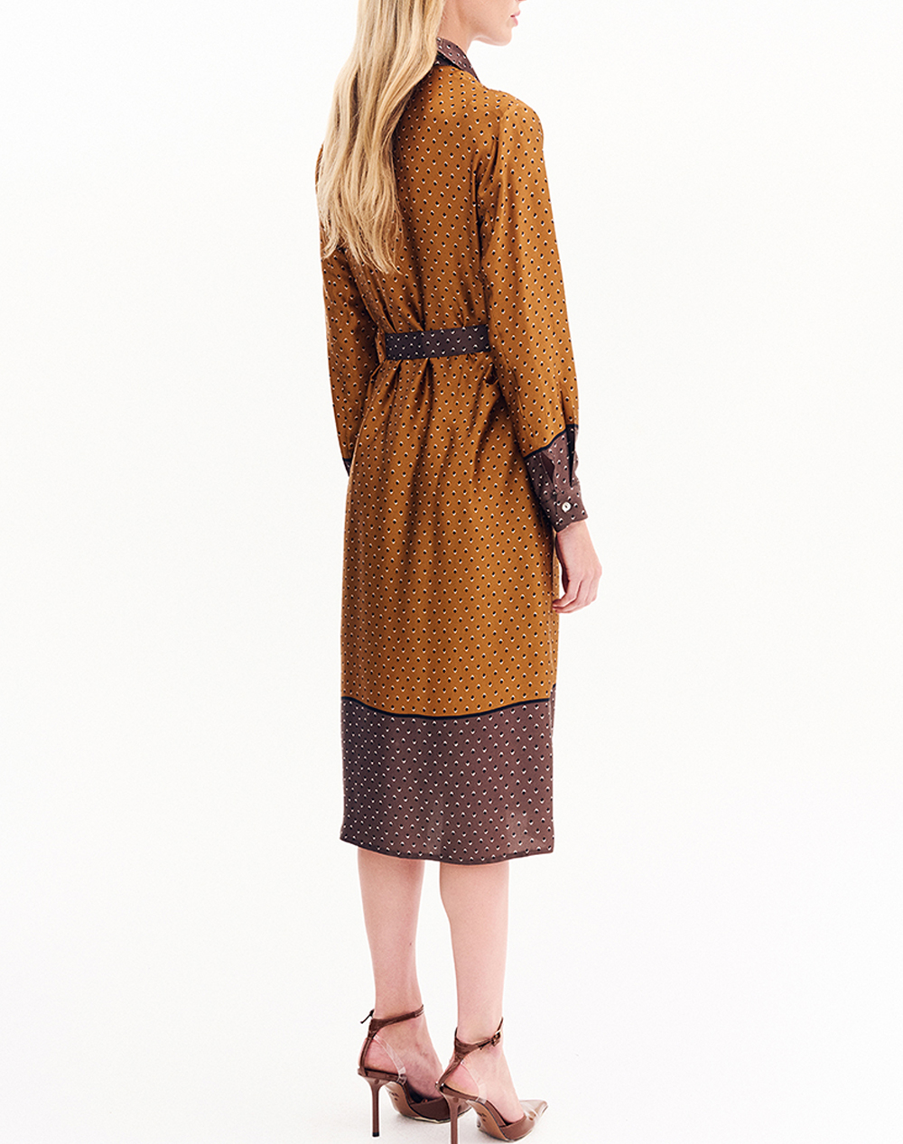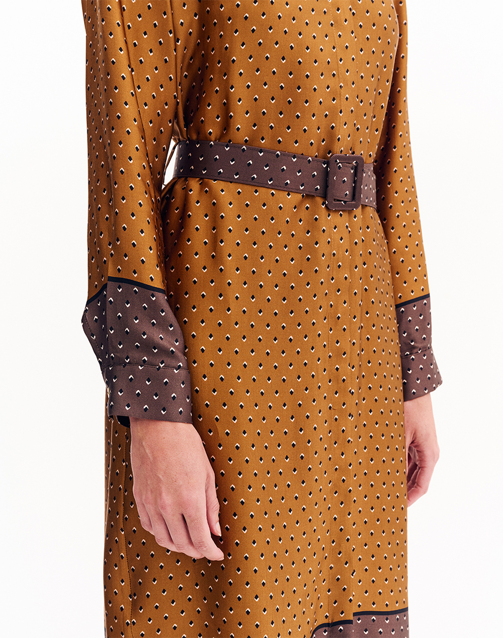 Γυναικείο φόρεμα σεμιζιέ, μακρυμάνικο, με εμπριμέ μοτίβο, γιακά πουκαμίσου, ζώνη ίδιας ύφανσης στη μέση και κλείσιμο κατά μήκος με κουμπιά. (Σύνθεση: 100% Βισκόζη)