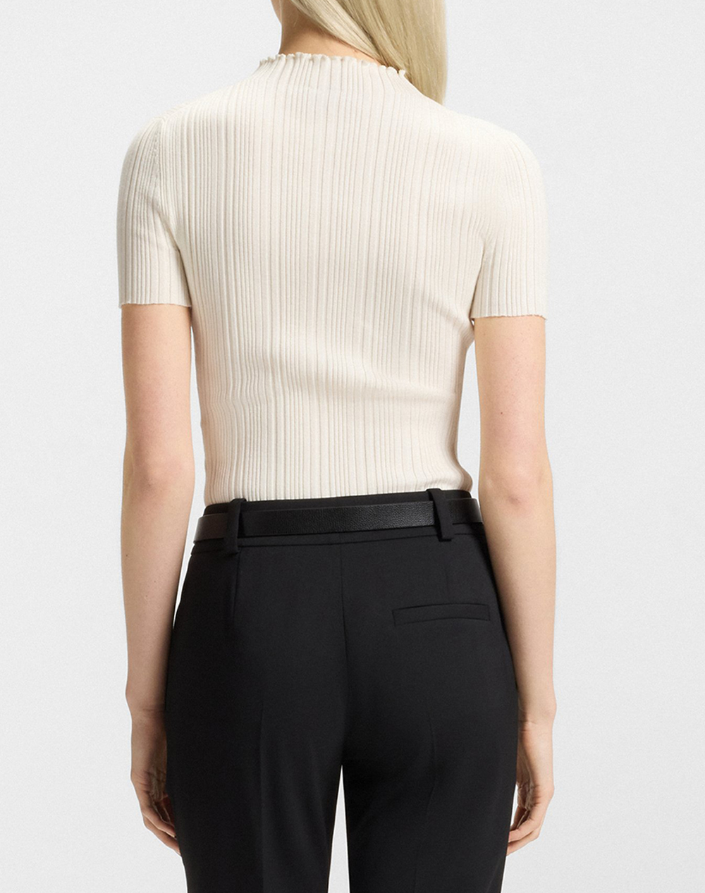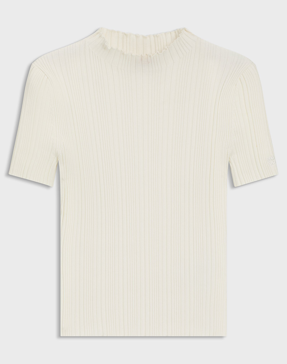 Γυναικεία μπλούζα, σε στενή γραμμή, κοντομάνικη, με λαιμόκοψη mock και rib ακανόνιστη ύφανση. (Σύνθεση: 76% Βισκόζη, 24% Πολυαμίδιο)