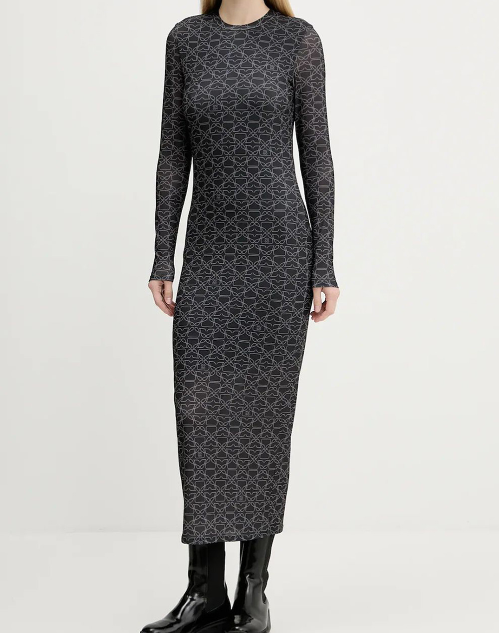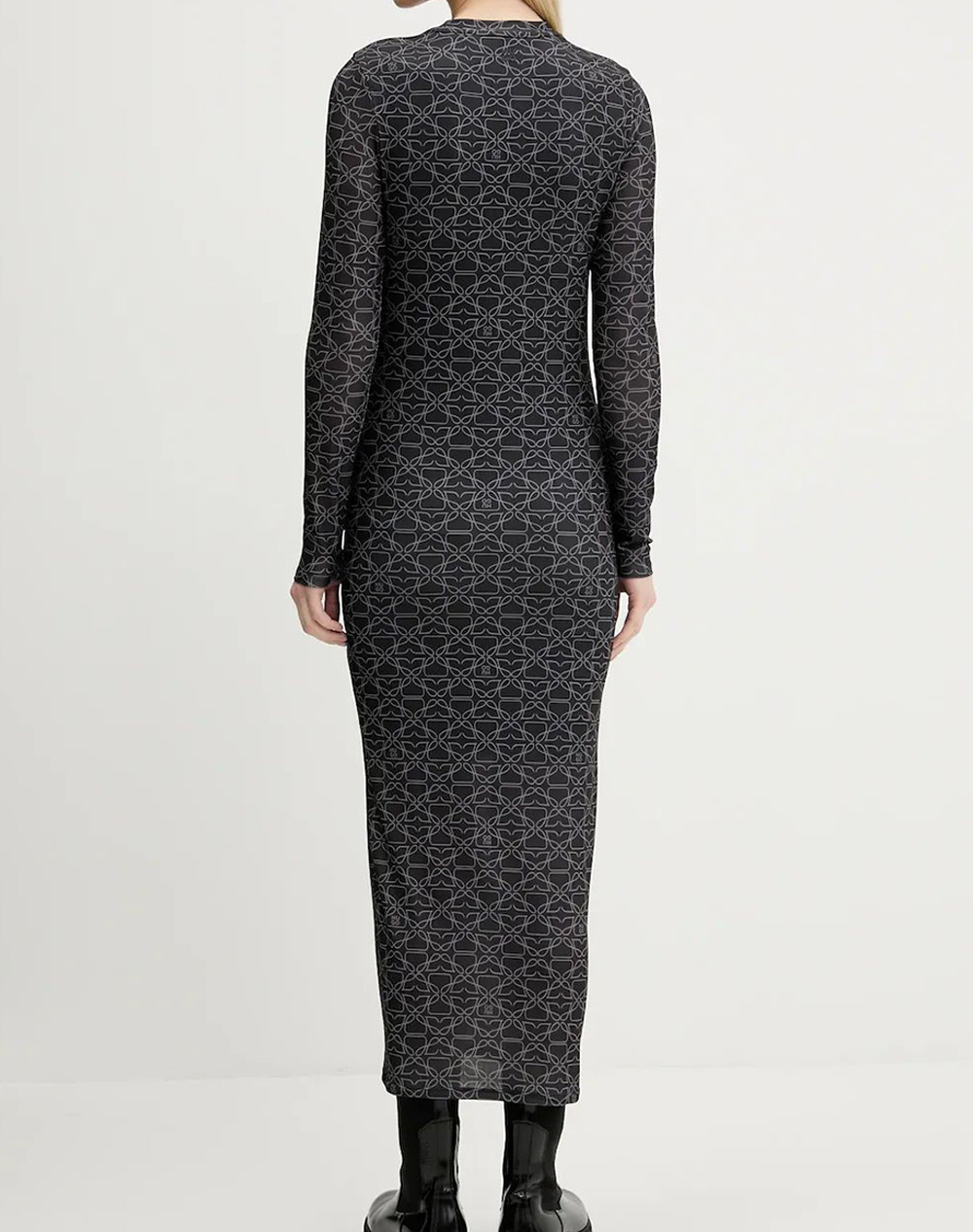 Γυναικείο μακρύ φόρεμα, σε στενή γραμμή, μακρυμάνικο, με στρογγυλή λαιμόκοψη και επαναλαμβανόμενο μοτίβο το λογότυπο. (Σύνθεση: 87% Πολυεστέρας, 13% Ελαστάνη)