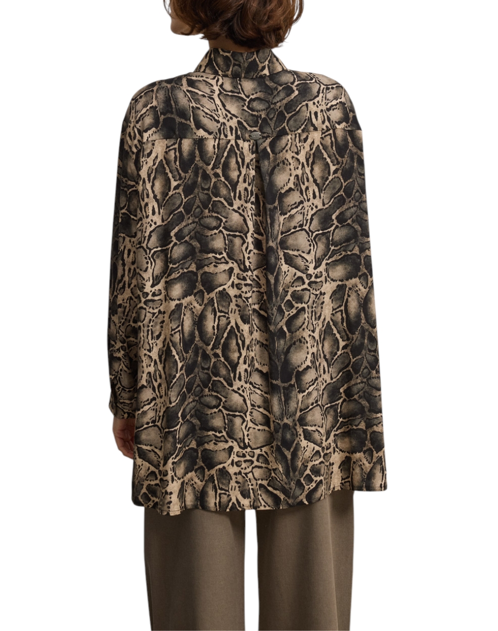 Γυναικείο πουκάμισο, μακρυμάνικο, με εμπριμέ μοτίβο, κλασικό γιακά, ασύμμετρο τελείωμα και κλείσιμο με κουμπιά μπροστά. (Σύνθεση: 100% Βισκόζη)