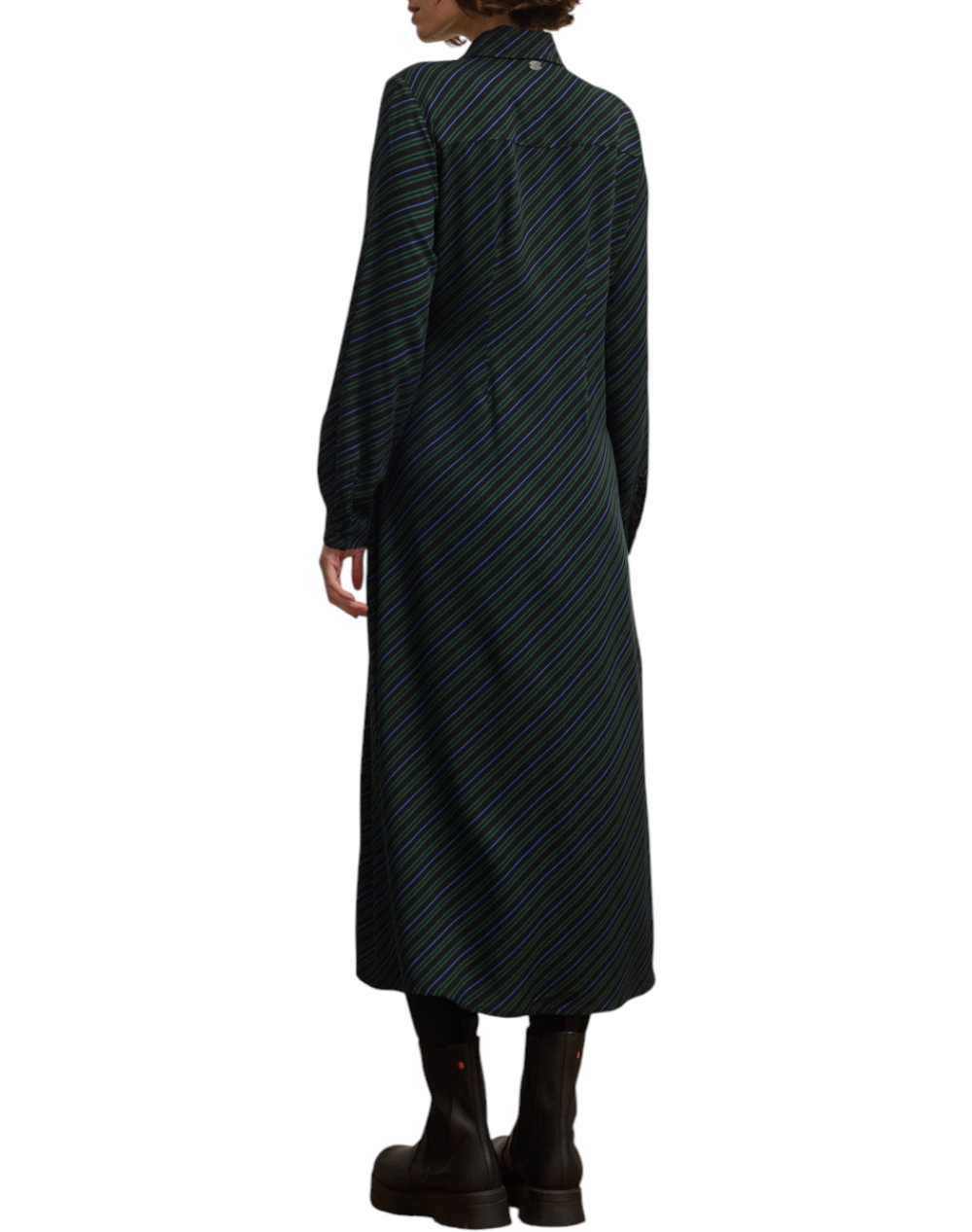 Γυναικείο midi φόρεμα, σε κανονική γραμμή, μακρυμάνικο, με διαγώνιο ριγέ print, κλασικό γιακά και κλείσιμο μπροστά με κουμπιά με κρυφή πατιλέτα. (Σύνθεση: 100% Βισκόζη)