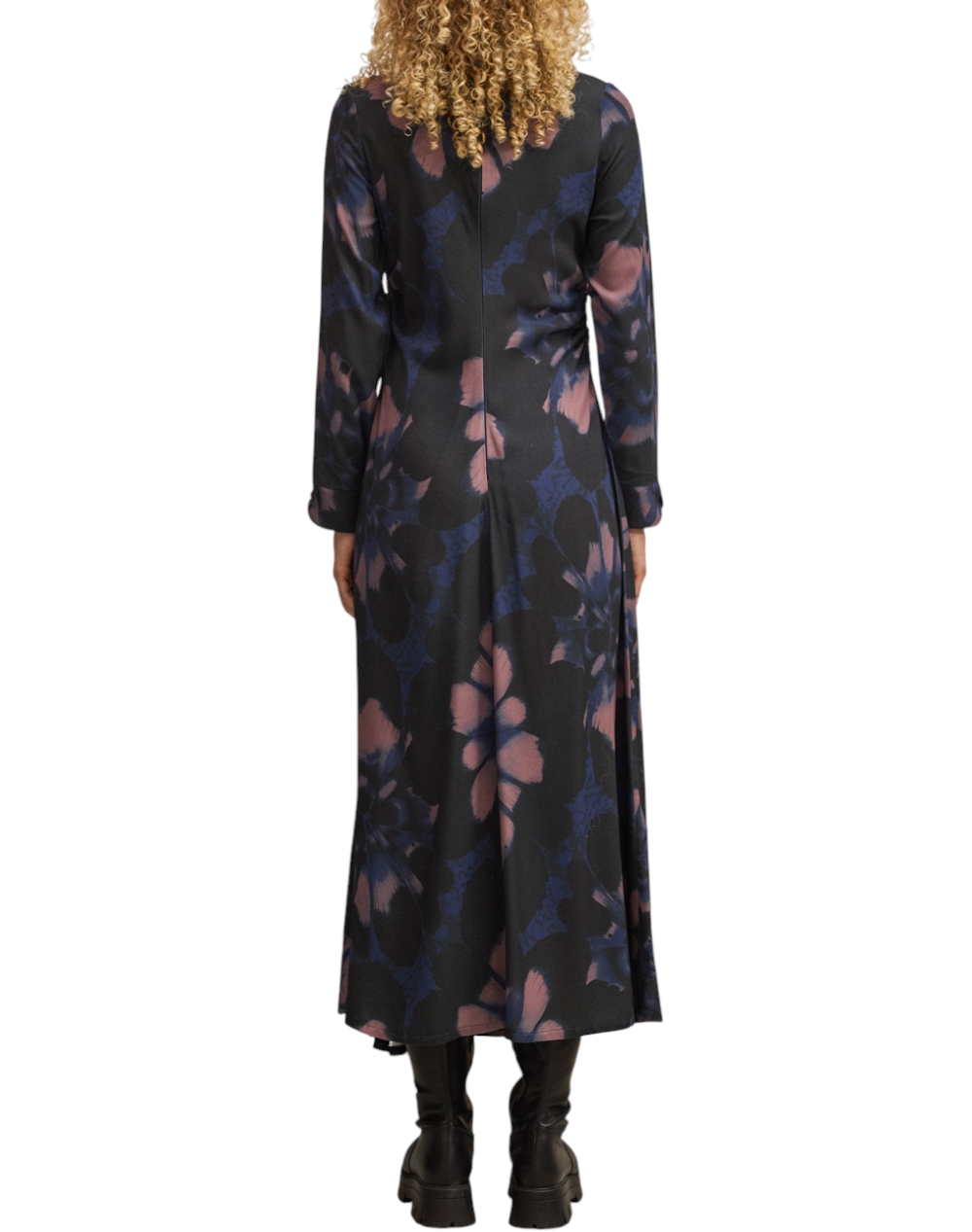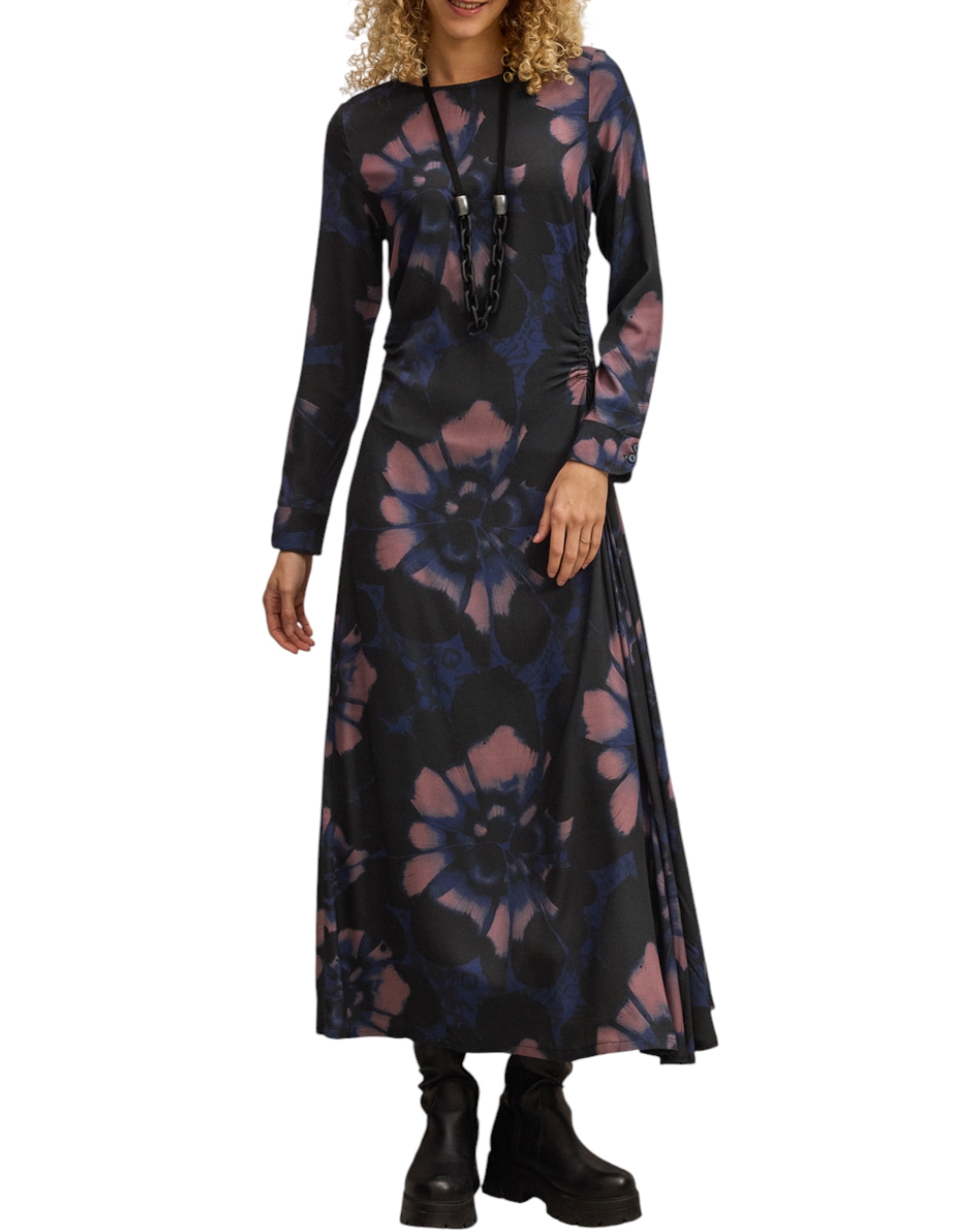 Γυναικείο midi φόρεμα, μακρυμάνικο, με floral print, σούρες στα πλαϊνά και κλείσιμο με φερμουάρ στην πλάτη. (Σύνθεση: 100% Βισκόζη)