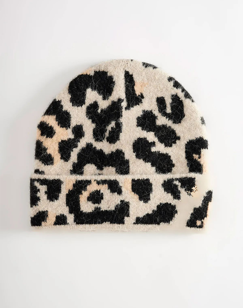 Γυναικείο πλεκτό σκουφί, τύπου beanie, με animal-print μοτίβο, με ρεβέρ στο τελείωμα και μεταλλικό λογότυπο στο πλάι. (Σύνθεση: 53% Ανακυκλωμένος Πολυεστέρας, 39% Ακρυλικό, 5% Μαλλί, 3% Ελαστάνη)