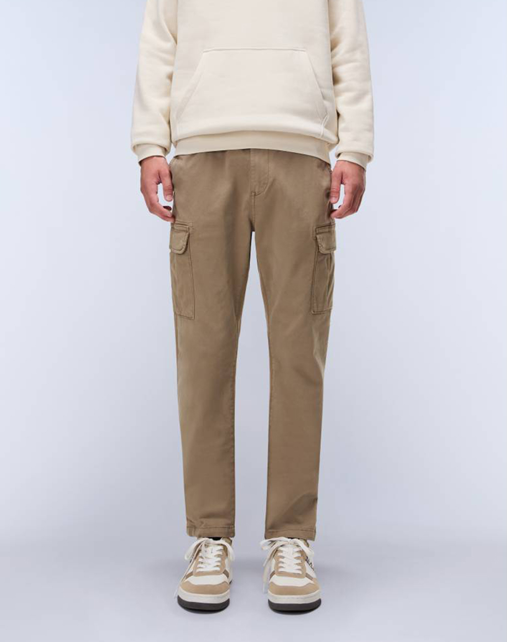 Ανδρικό παντελόνι cargo, σε κανονική γραμμή, με κοφτές μπροστινές τσέπες, πίσω τσέπες με καπάκι και πλαϊνές τσέπες cargo. Κλείνει μπροστά με φερμουάρ και κουμπί. (Σύνθεση: 98% Βαμβάκι, 2% Ελαστάνη)