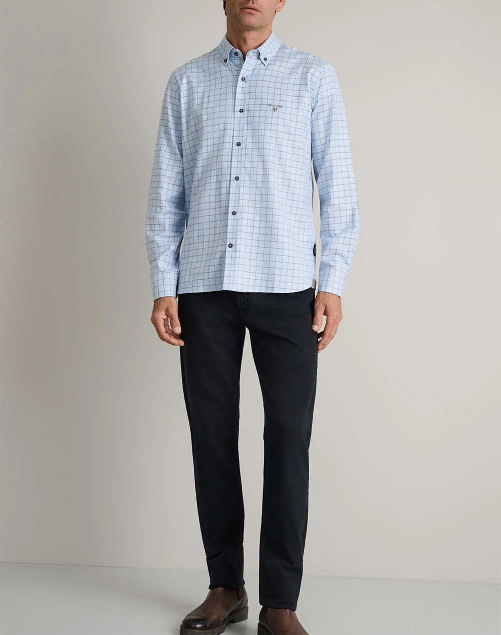 Ανδρικό πουκάμισο σε κανονική γραμμή, μακρυμάνικο, με καρό μοτίβο, button down γιακά, λογότυπο στο στήθος και κλείσιμο με κουμπιά μπροστά. (Σύνθεση: 100% Βαμβάκι)