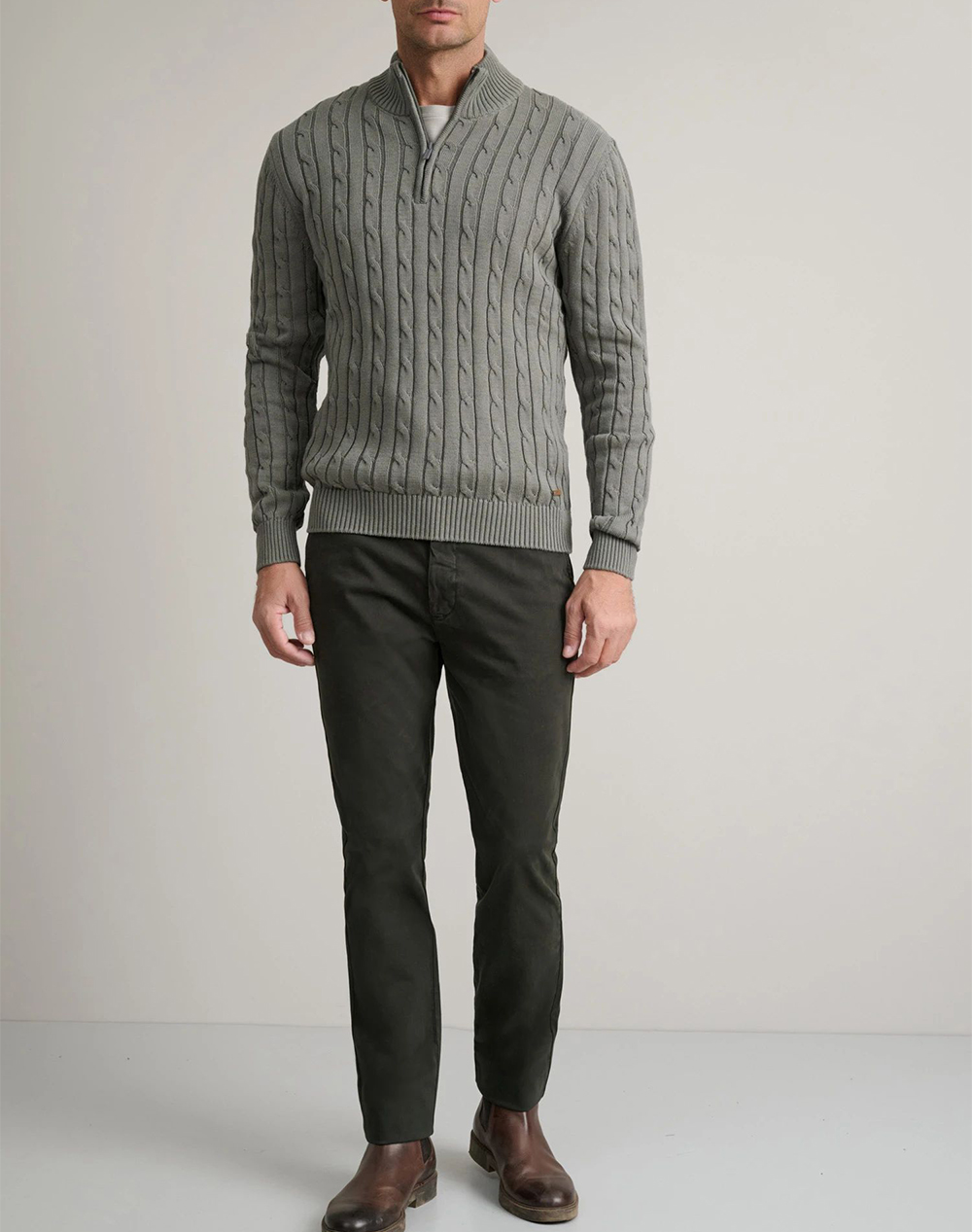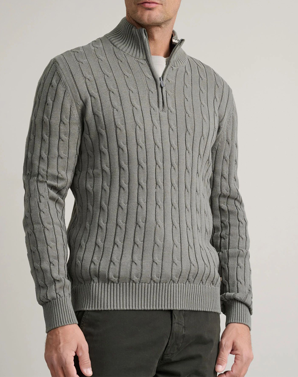 Ανδρική πλεκτή μπλούζα, σε κανονική γραμμή, μακρυμάνικη, με cable πλέξη και όρθιο γιακά με half zip. (Σύνθεση: 100% Βαμβάκι)