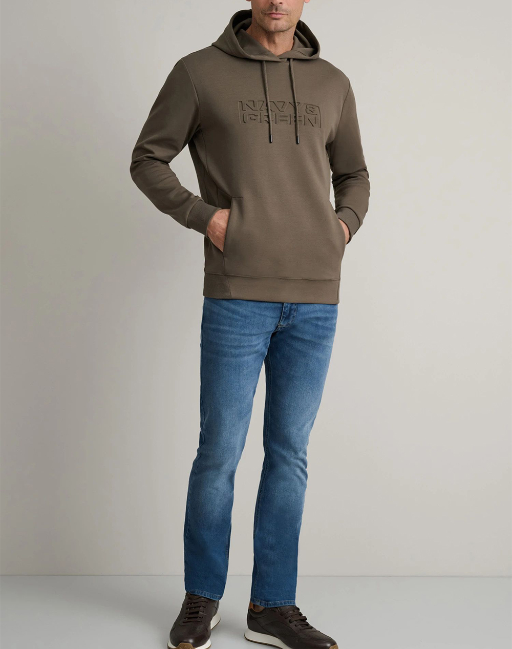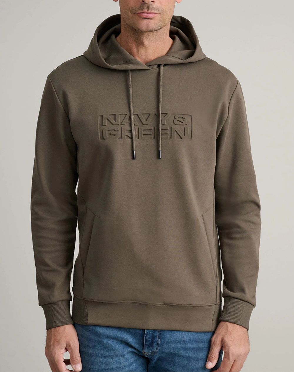 Ανδρική μπλούζα φούτερ, σε κανονική γραμμή, μακρυμάνικη, με ανάγλυφο λογότυπο μπροστά, τσέπη καγκουρό και κουκούλα με ρυθμιζόμενο κορδόνι. (Σύνθεση: 79% Βαμβάκι, 13% Πολυεστέρας, 8% Ελαστάνη)