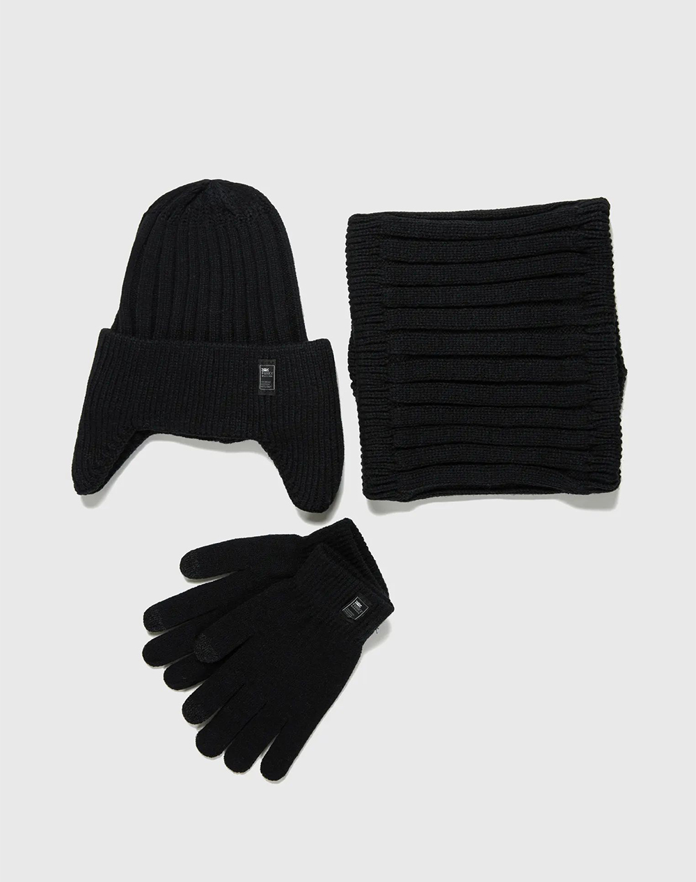 Ανδρικό σετ με λαιμό, γάντια, σκούφο από συνθετικό ύφασμα.
