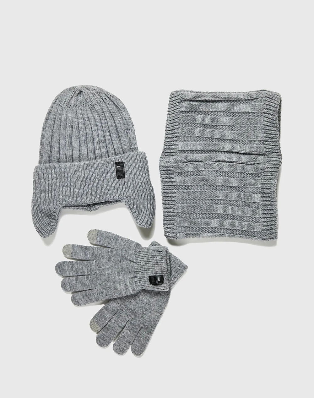 Ανδρικό σετ με λαιμό, γάντια, σκούφο από συνθετικό ύφασμα.
