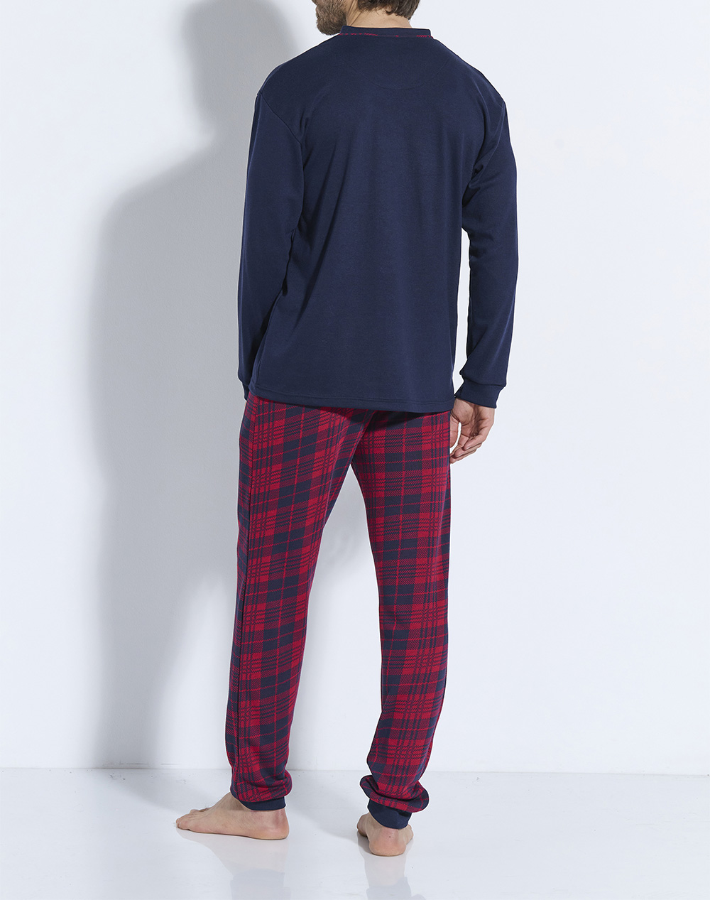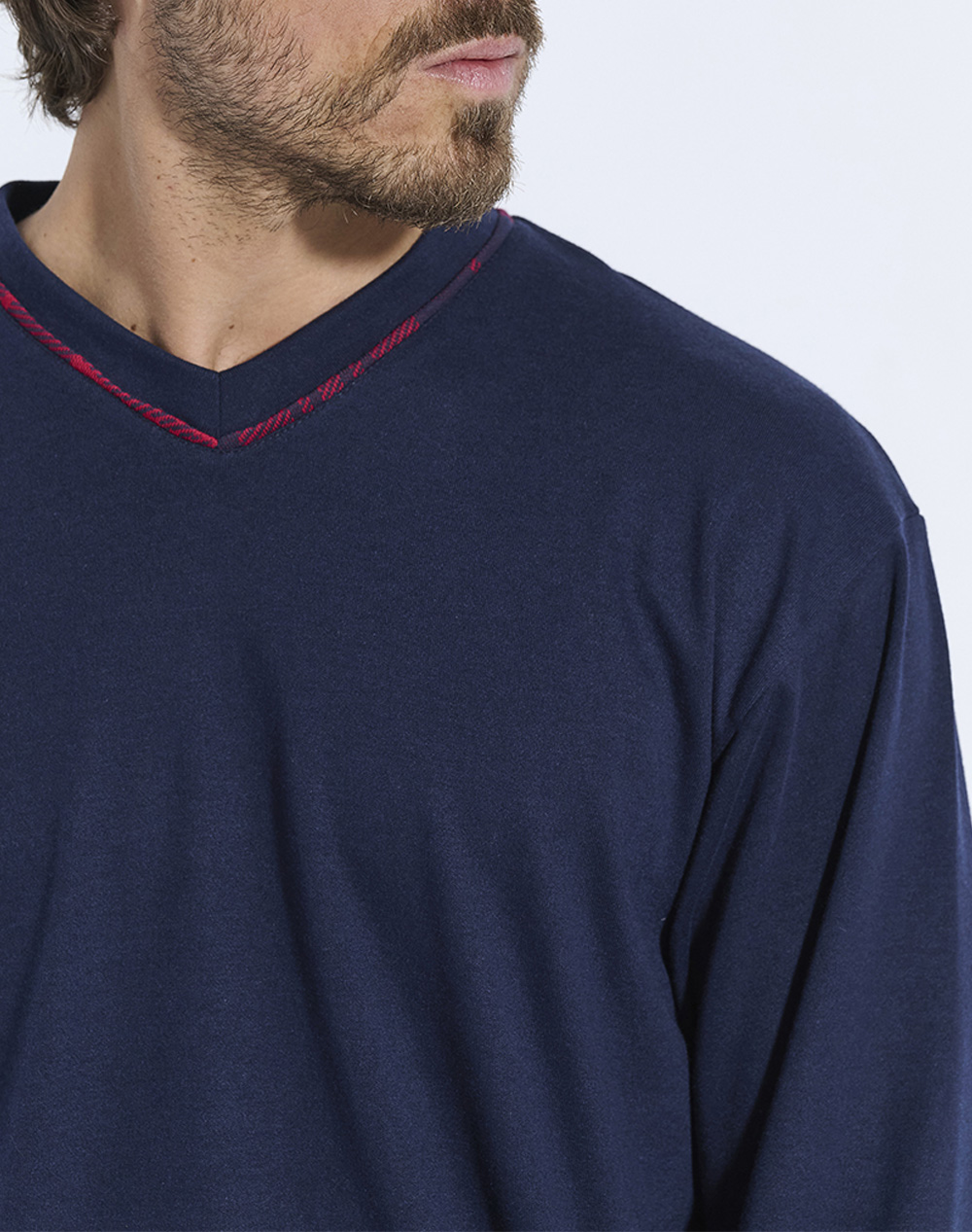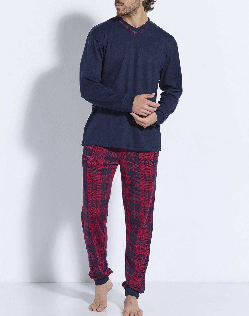 Ανδρική πυτζάμα, με μακρυμάνικη μπλούζα με "V" λαιμόκοψη και καρό παντελόνι με ελαστικό τελείωμα. (Σύνθεση: 65% Βαμβάκι, 35% Πολυεστέρας)