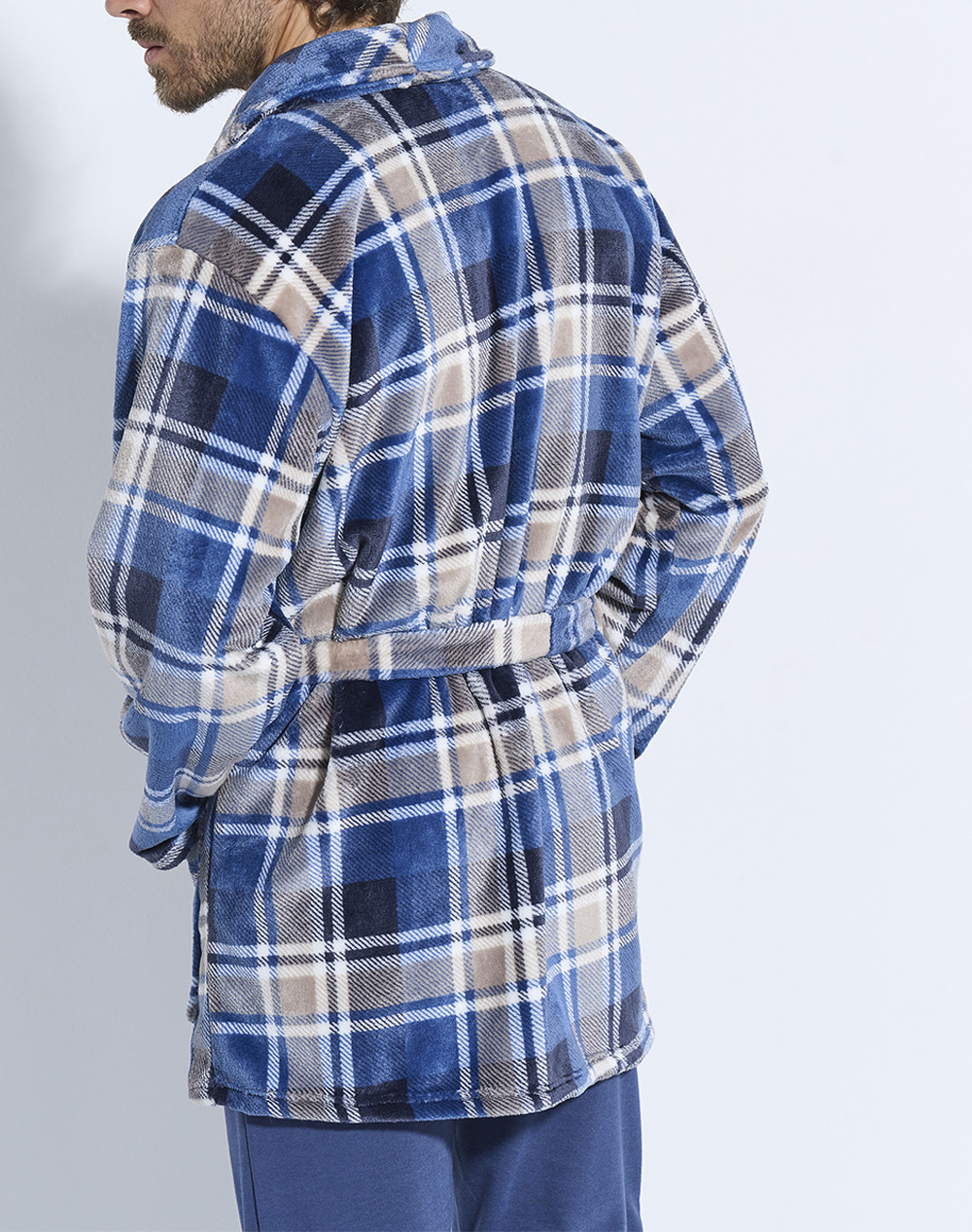 Ανδρική καρό ρόμπα, μακρυμάνικη, με μήκος 3/4, σταυρωτό κλείσιμο με ζώνη και τσέπες μπροστά. (Σύνθεση: 100% Πολυεστέρας)