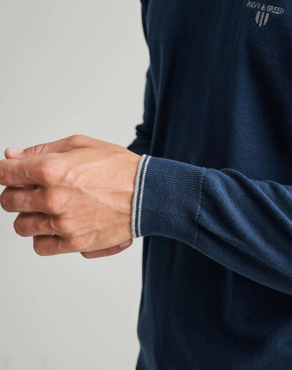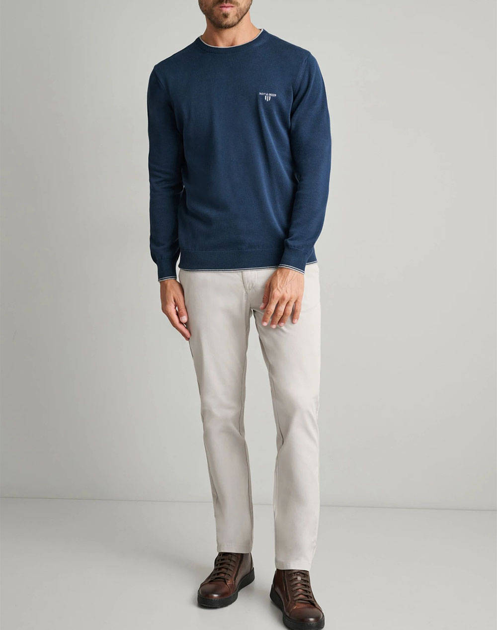 Ανδρική πλεκτή μπλούζα, σε κανονική γραμμή, μονόχρωμη, μακρυμάνικη, με στρογγυλή λαιμόκοψη με contrast λεπτομέρεια και λογότυπο στο στήθος.(Σύνθεση: 100% Βαμβάκι)